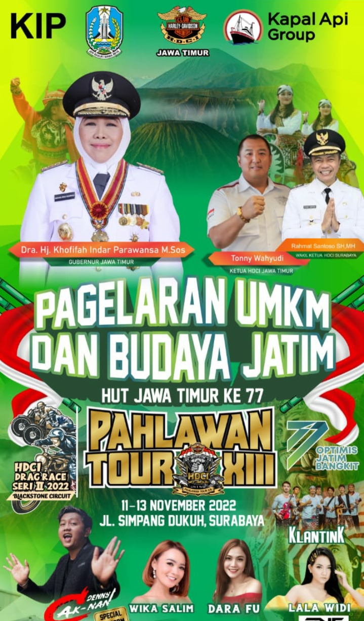 MEGAPOLITANPOS.COM, Blitar - Untuk mendorong Jawa Timur bangkit sebuah perkumpulan Motor Gede (Moge) menggelar acara spektakuler yang diinisiasi oleh Harley Davidson Club Indonesia (HDCI) dengan Pemerintah Provinsi Jawa Timur bertajuk 10 November Pekan UMKM dan budaya Jawa Timur, selain memperingati hari pahlawan 10 November kegiatan kolaborasi antara HDCI dengan Pemprov Jatim juga serangkaian peringatan HUT Pemprov Jatim ke - 77. Acara bertempat dijalan Simpang Dukuh Surabaya digelar dari tanggal 11 hingga 13 November mendatang.