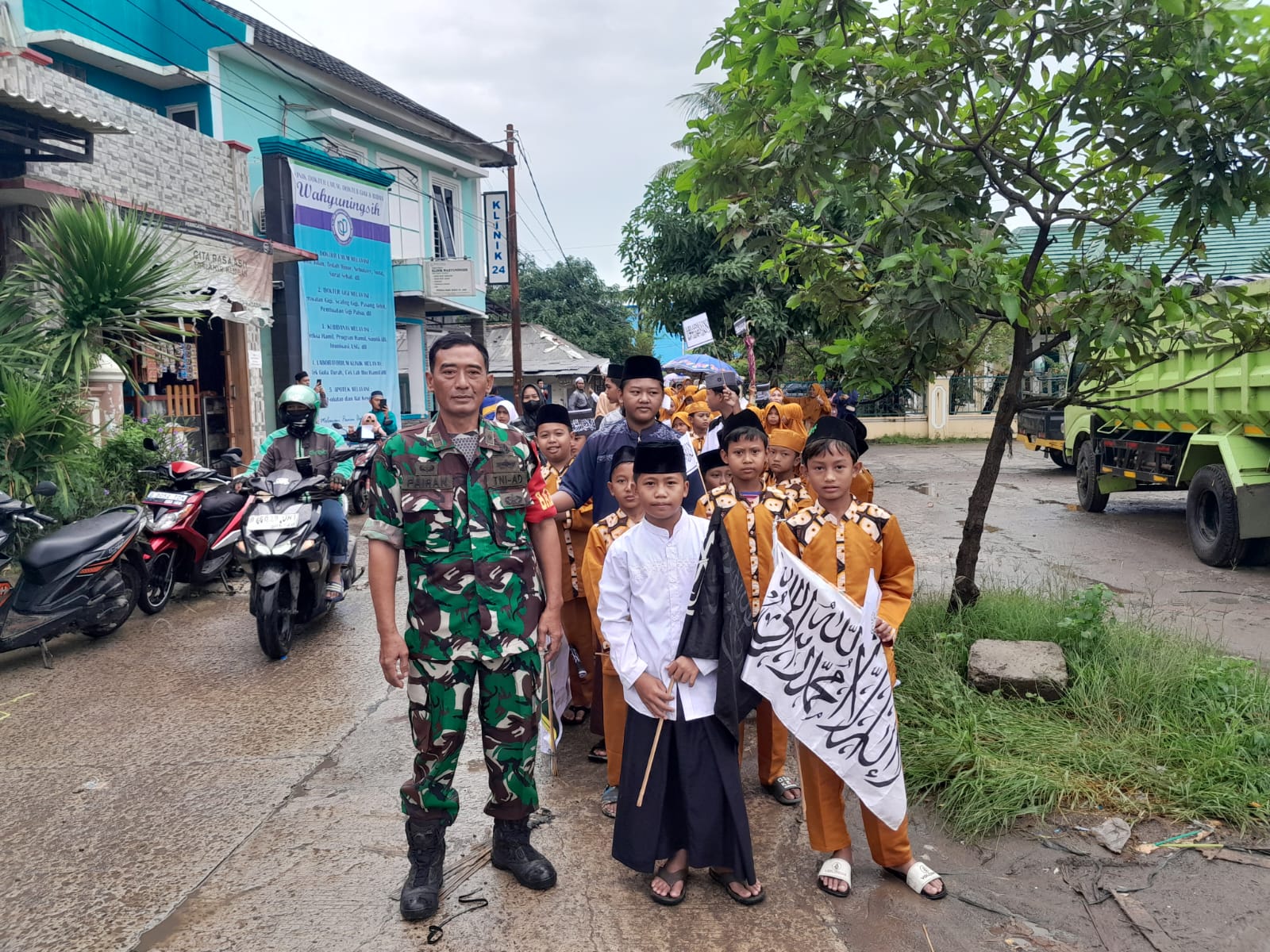 Danramil 01/Tln Mayor Inf Heru Susanto melalui Pelda Pairin Babinsa Desa Kosambi Timur menjelaskan, tradisi tahun baru Islam dilaksanakan pawai dengan jalan kaki oleh seluruh ustad dan anak- anak santri dan warga desa Kosambi Timur.