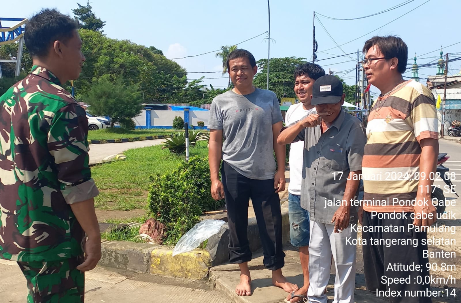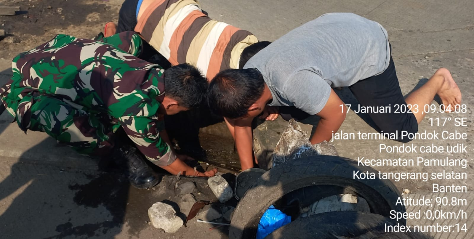 MEGAPOLITANPOS.COM Kota Tangsel - Upaya mengantisipasi banjir dan timbulnya penyebaran wabah penyakit di lingkungan, Babinsa Kelurahan Pondok Cabe Udik, Koramil 09/Pamulang, Kodim 0506/Tgr melaksanakan Karya Bakti TNI, di wilayah Kelurahan Pondok Cabe Udik Kecamatan Pamulang, Kota Tangsel, Kamis (18/01/2024).