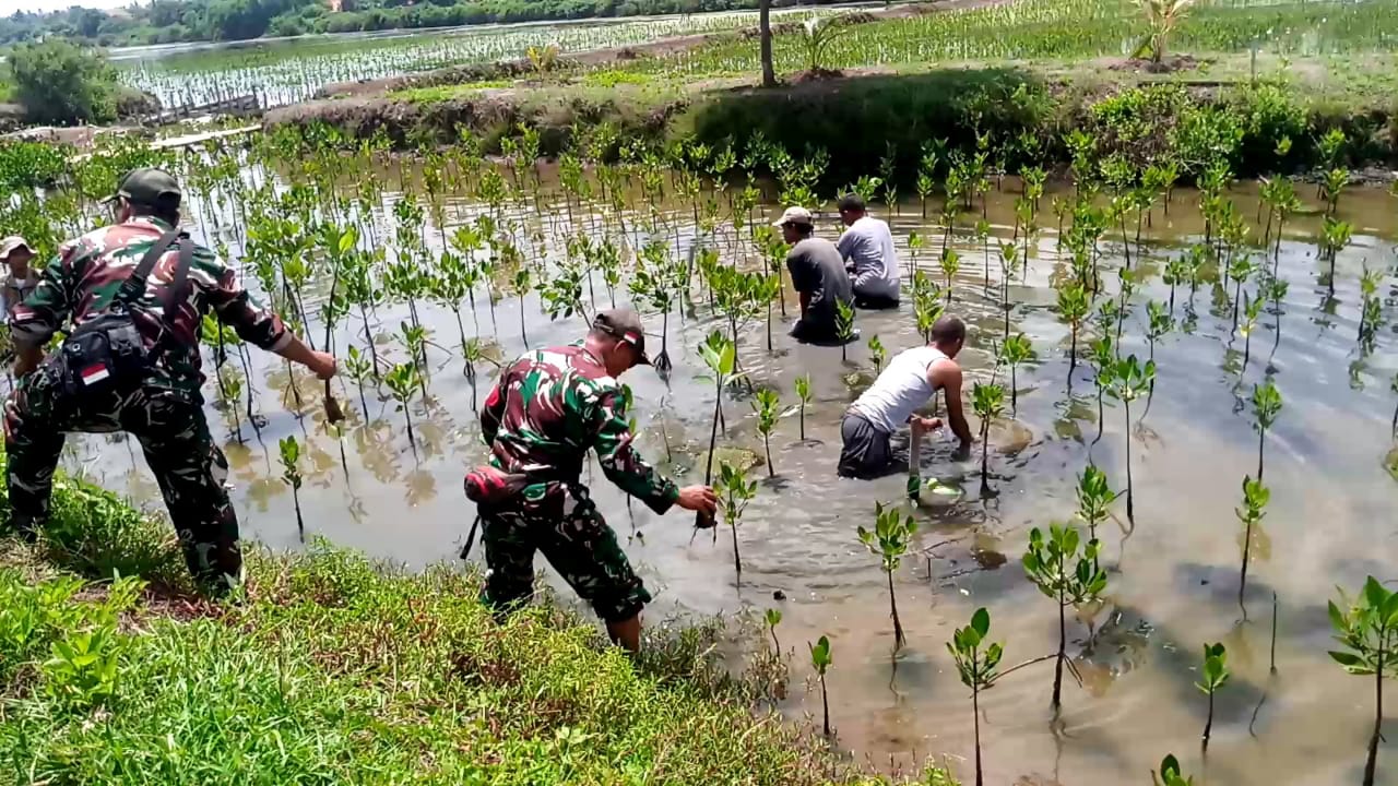 MEGAPOLITANPOS.COM Kab Tangerang, Tigaraksa - Menjaga kelestarian alam, Babinsa Koramil 09/Mauk, Kodim 0510/Trs yang di pimpin Peltu Arif membantu penanaman, perawatan mangrove di desa Ketapang RT 11 / 05 Kampung pelelangan kecamatan Mauk Kabupaten Tanggerang, Kamis (07/03/2024).