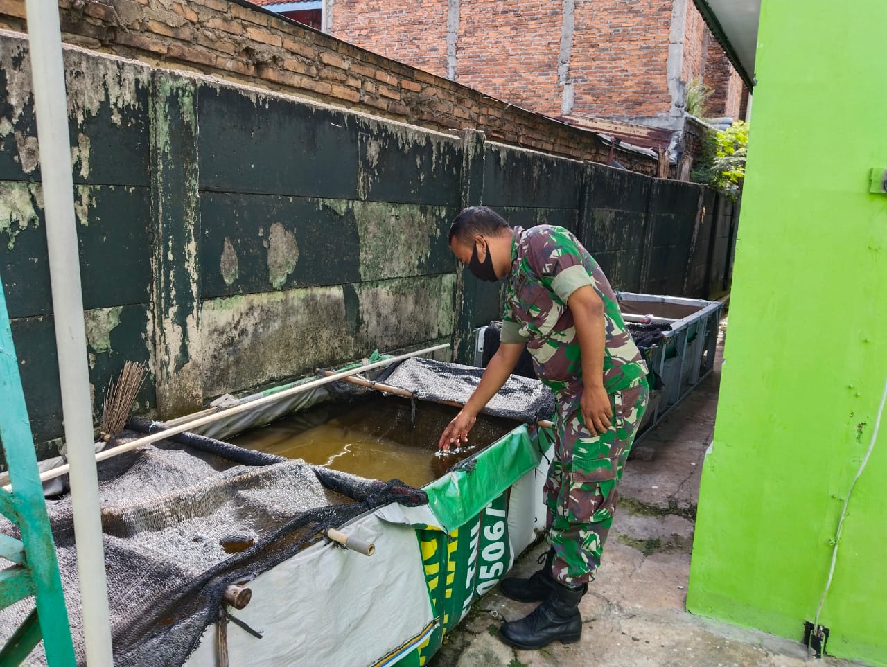 Keterangan Gambar : Babinsa Karang Tengah Koramil 04 Ciledug Kodim 0506/Tgr Seda Deli secara rutin memelihara ketahanan pangan dengan memberikan pakan lele