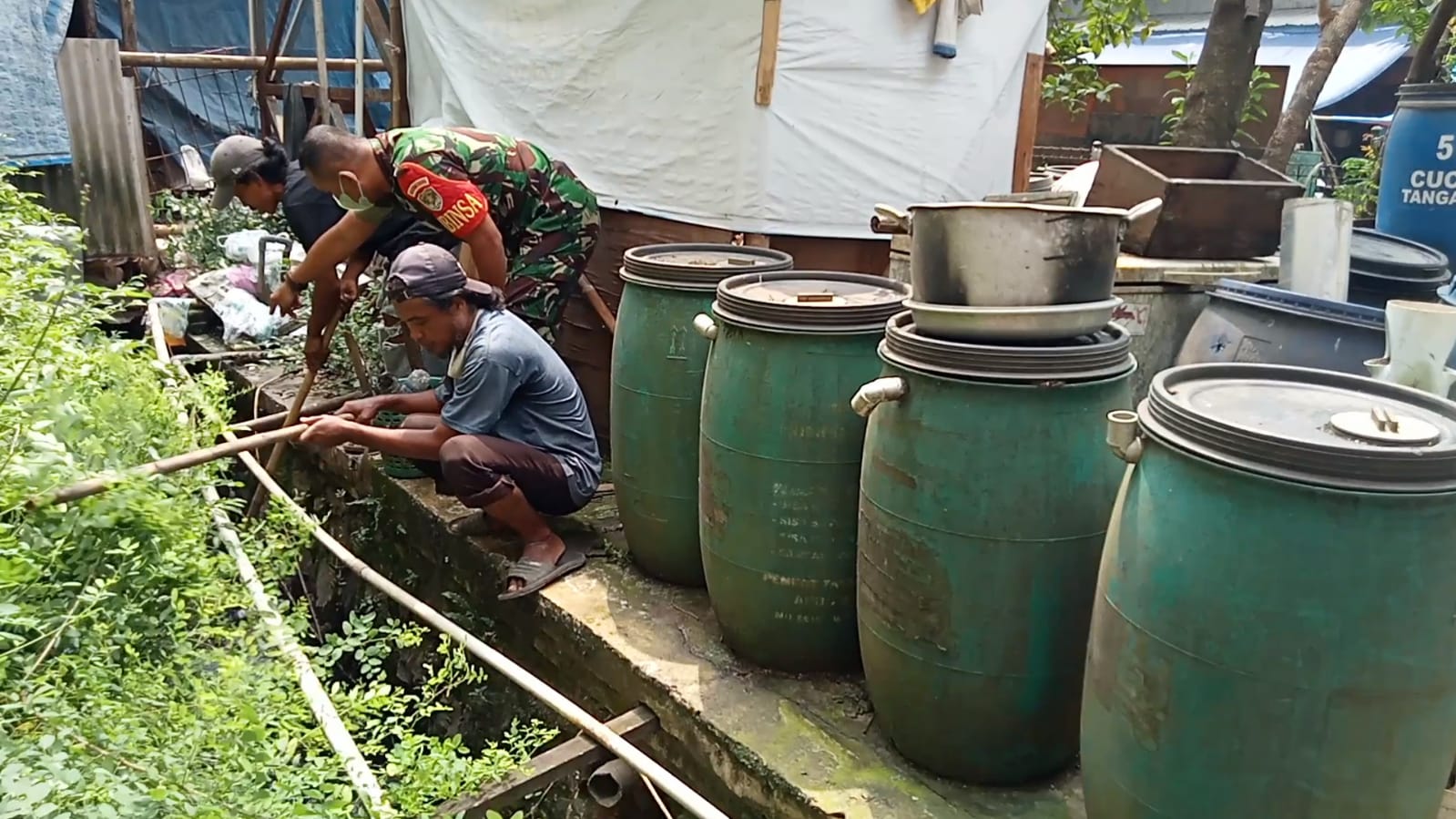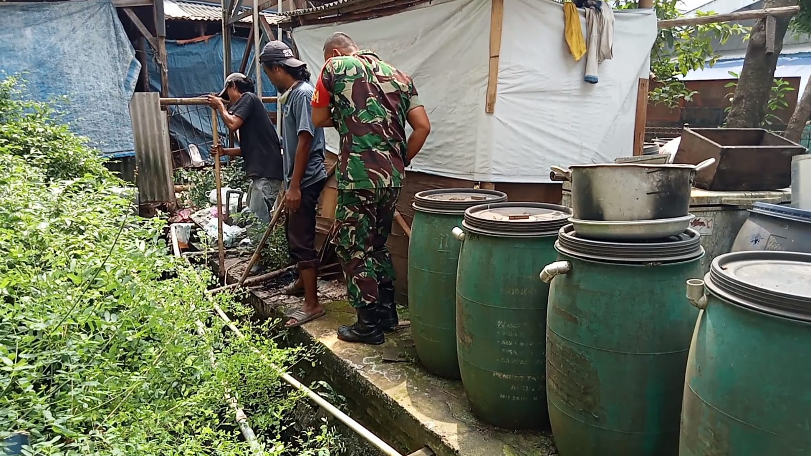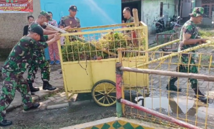 Membersihkan sampah TNI (Babinsa) wilayah bersama warga melaksanakan kegiatan gotong royong bahu membahu menggunakan gerobak dorong mengangkut sampah.