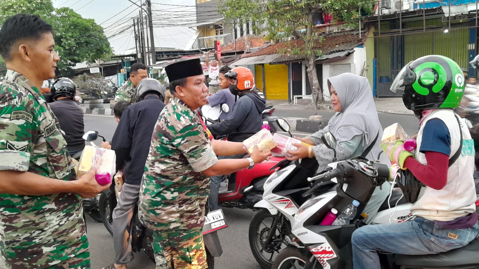 Paket takjil yang di bagikan Koramil 04/Ciledug kepada warga masyarakat berupa makanan dan minuman jus botol, baik pengguna jalan kaki, roda dua dan roda empat.