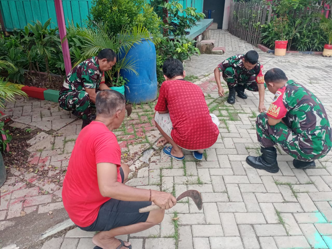 "Dalam kerja Bakti tersebut personil TNI Koramil 01/Tgr tidak lagi mengangkat senjata, melainkan mengangkat cangkul, sabit, mesin babat rumput, linggis dan bangkil untuk membersihkan lingkungan," ujarnya.