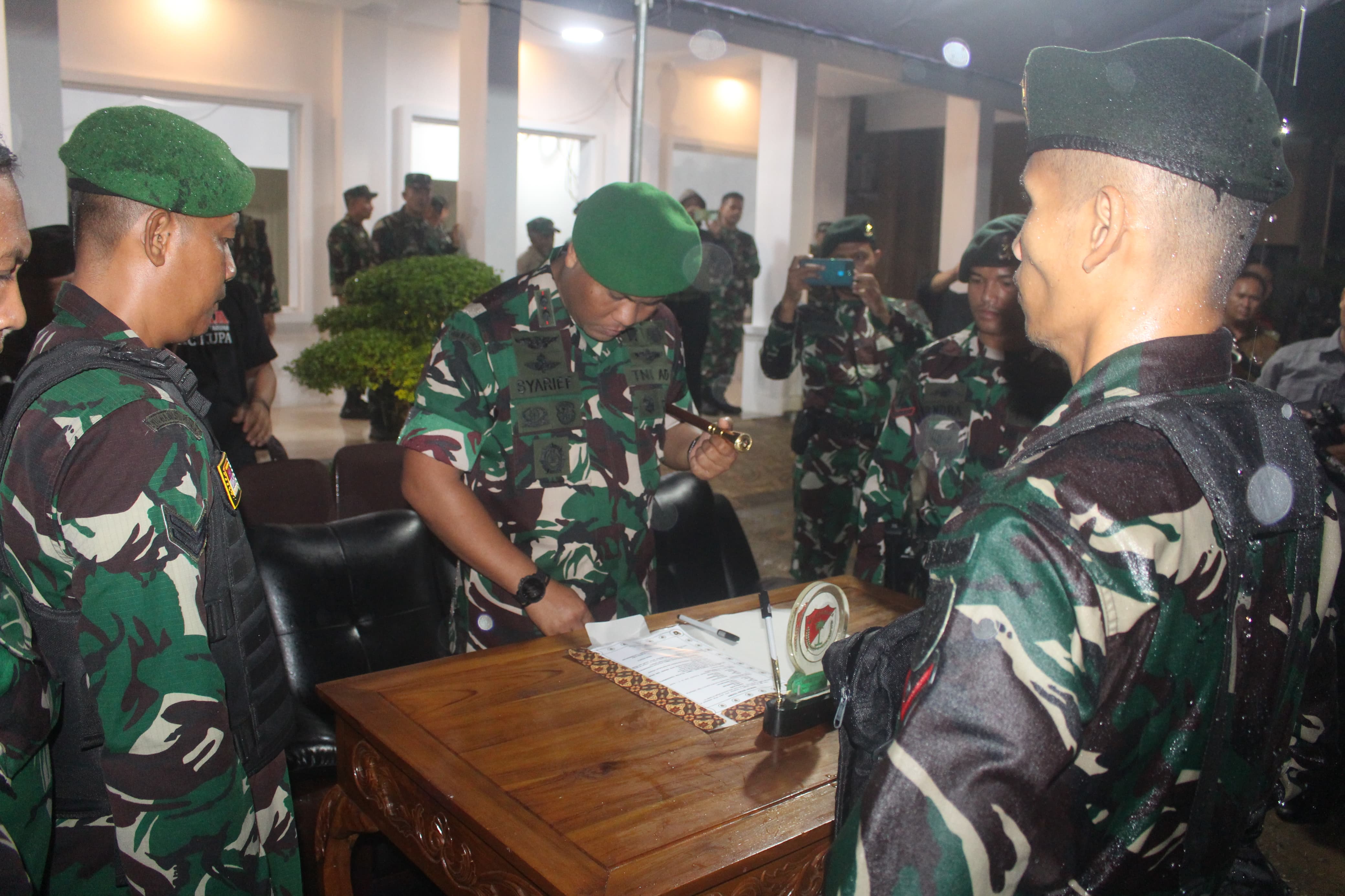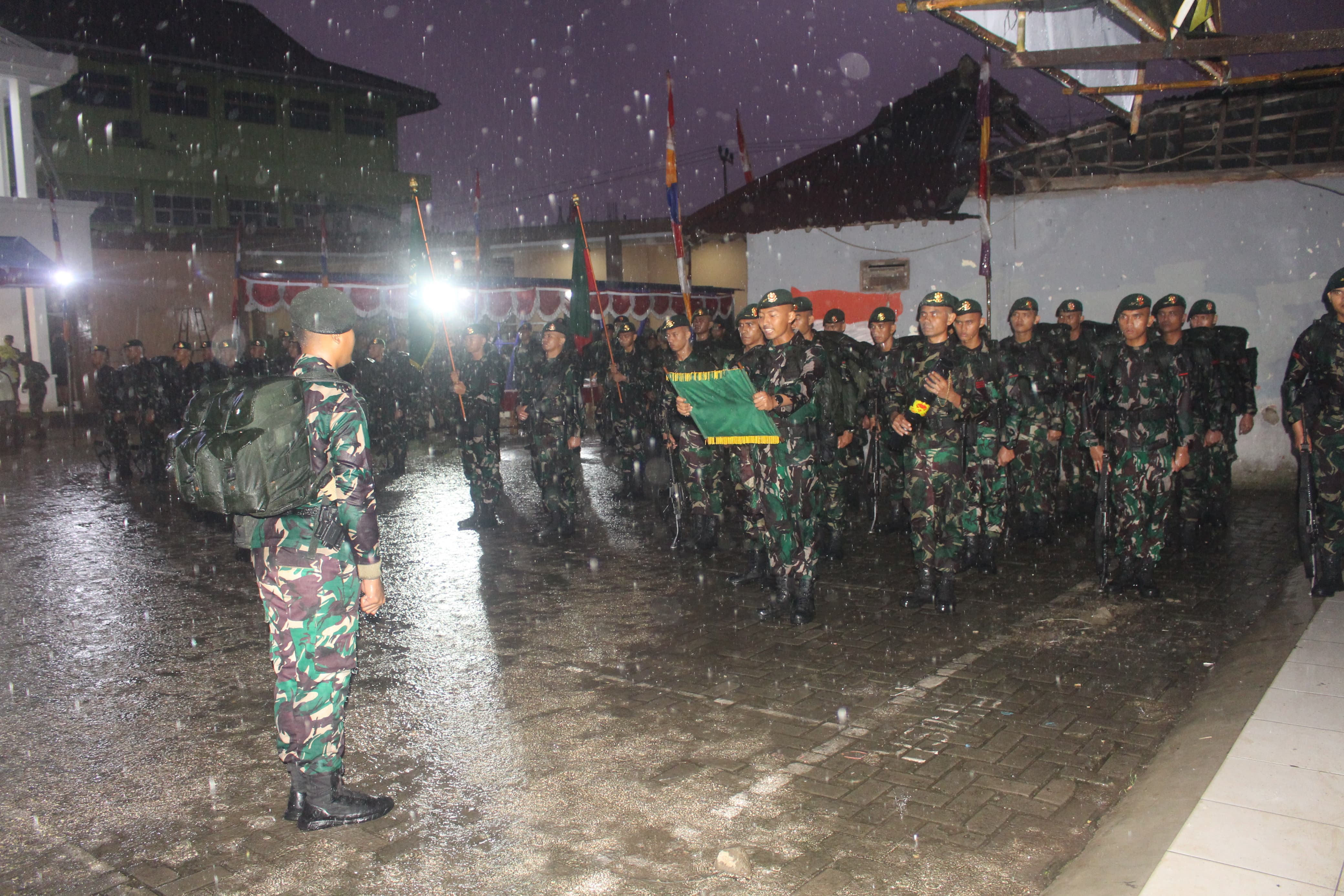 Upacara Serah Terima Estafet Pleton Beranting Yudha Wastu Pramuka Jaya (YWPJ) tahun 2024, dari Pleton Yonif 328/DGH kepada Pleton Yonif 202/TM, di SMP Negeri 5 Cikupa Kabupaten Tangerang, Selasa dinihari (17/12/2024).