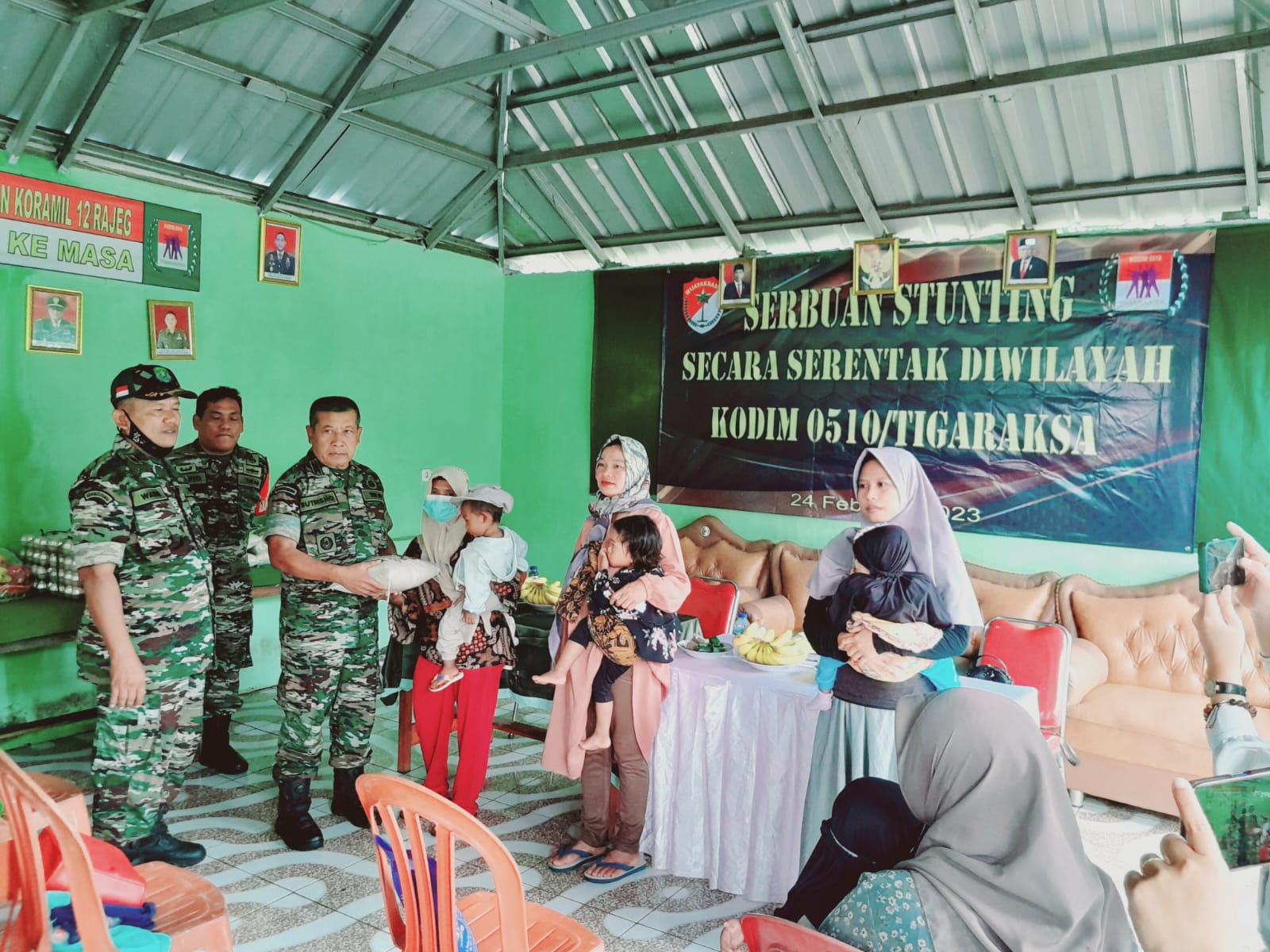 Danramil 12/Rajeg Kapten Inf Sutrisno menggelar serbuan stunting kepada ibu hamil dan balita, pada kegiatan ini Koramil berupaya membantu pencegahan resiko Stunting dengan beberapa kegiatan diantaranya memberikan bantuan protein Hewani (Telur), dan pemberian Sembako kepada keluarga anak Stunting.