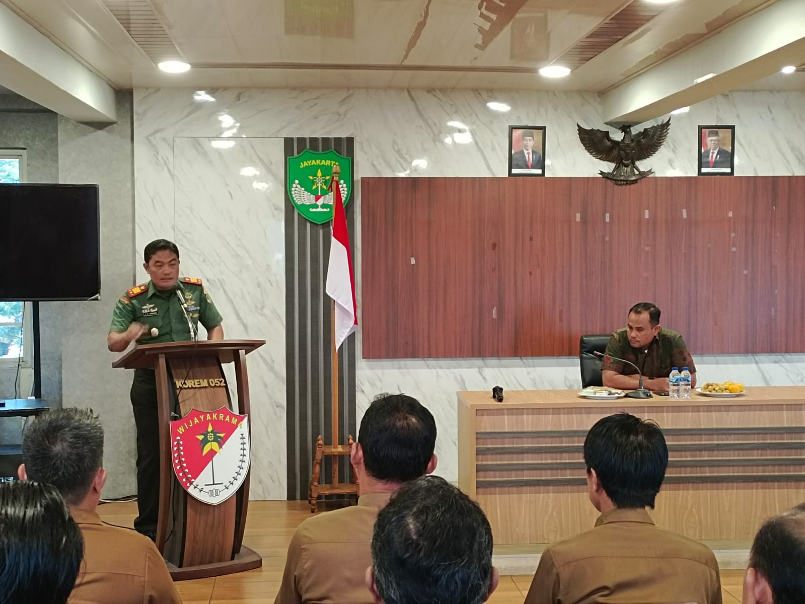 Keterangan Gambar : Danrem 052/Wkr, Brigjen TNI Putranto Gatot Sri Handoyo, S. Sos, M.M. memimpin langsung pelepasan para perwira Korem 052/Wkr pindah satuan