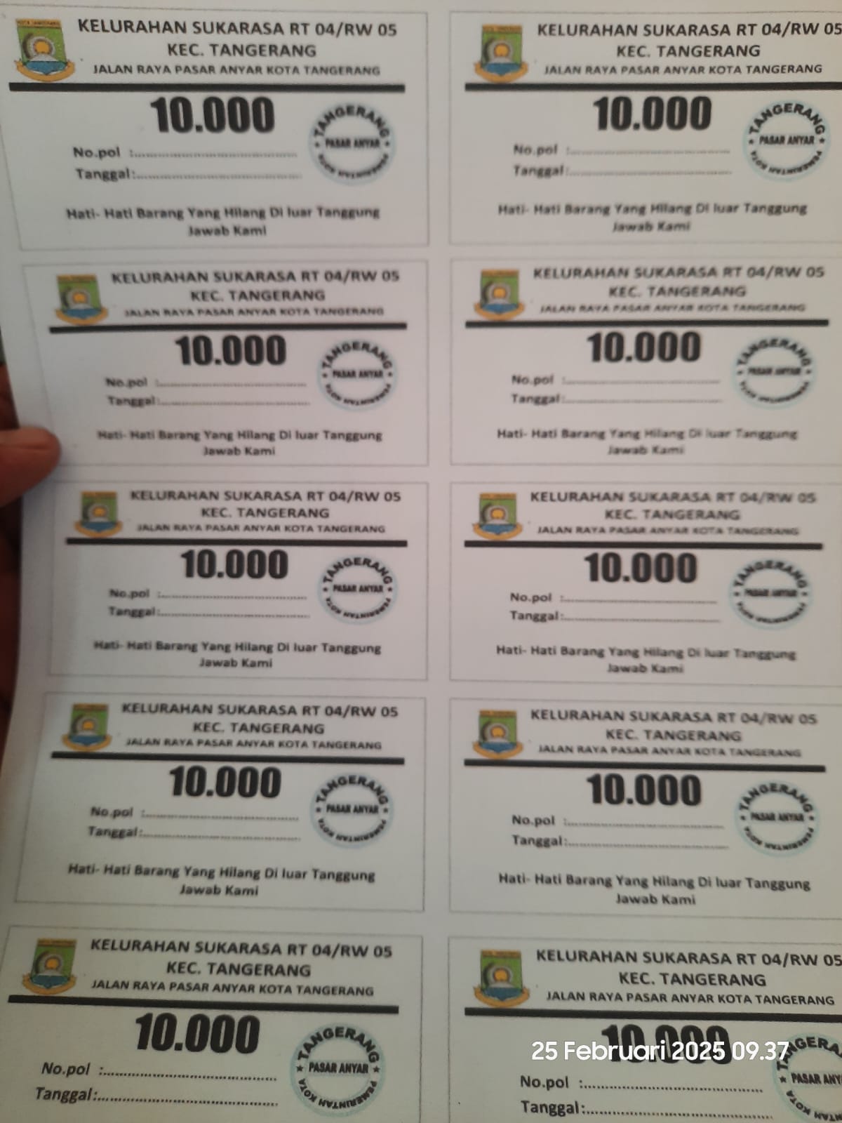 Dalam karcis parkir tersebut tertera logo Pemkot Tangerang bertuliskan Kelurahan Sukarasa, RT04/RW 05 Kecamatan Tangerang, Jalan Raya Pasar Anyar Kota Tangerang dengan nominal Rp. 10.000,-.