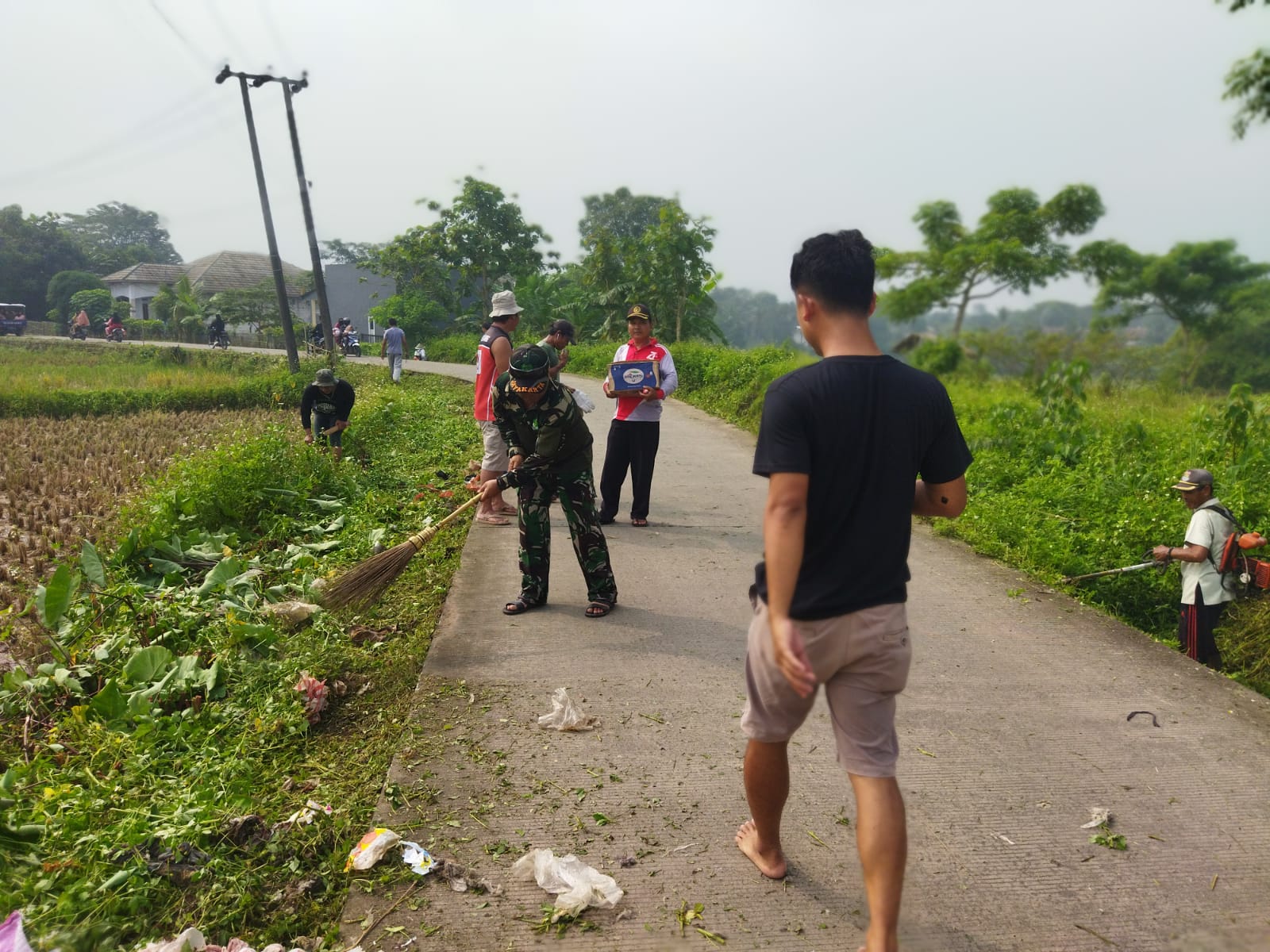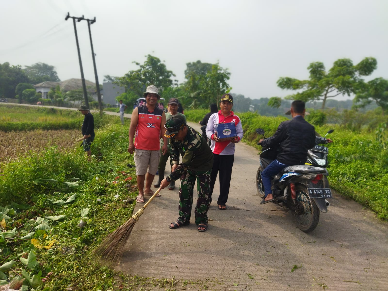 Keterangan Gambar : Babinsa Kubang Koramil 05/Blj, Kodim 0510/Trs Serma Sugandi bersama Bhabimkamtibmas melaksanakan karya bakti pembersihan jalan Desa Kubang Kecamatan Sukamulya