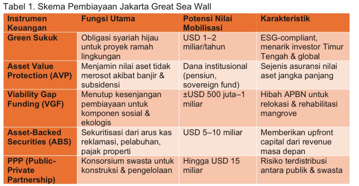Adapun estimasi biaya Giant Sea Wall mencapai US$ 40-nda miliar (hanya mencakup Jakarta saja). Angka sebesar itu mustahil ditanggung APBN sepenuhnya, mengingat prioritas lain pada pendidikan, kesehatan, dan pembangunan infrastruktur nasional. "Solusinya adalah pembiayaan campuran (blended finance), memadukan dana publik, swasta, dan investor global melalui instrumen keuangan inovatif," seru dia.