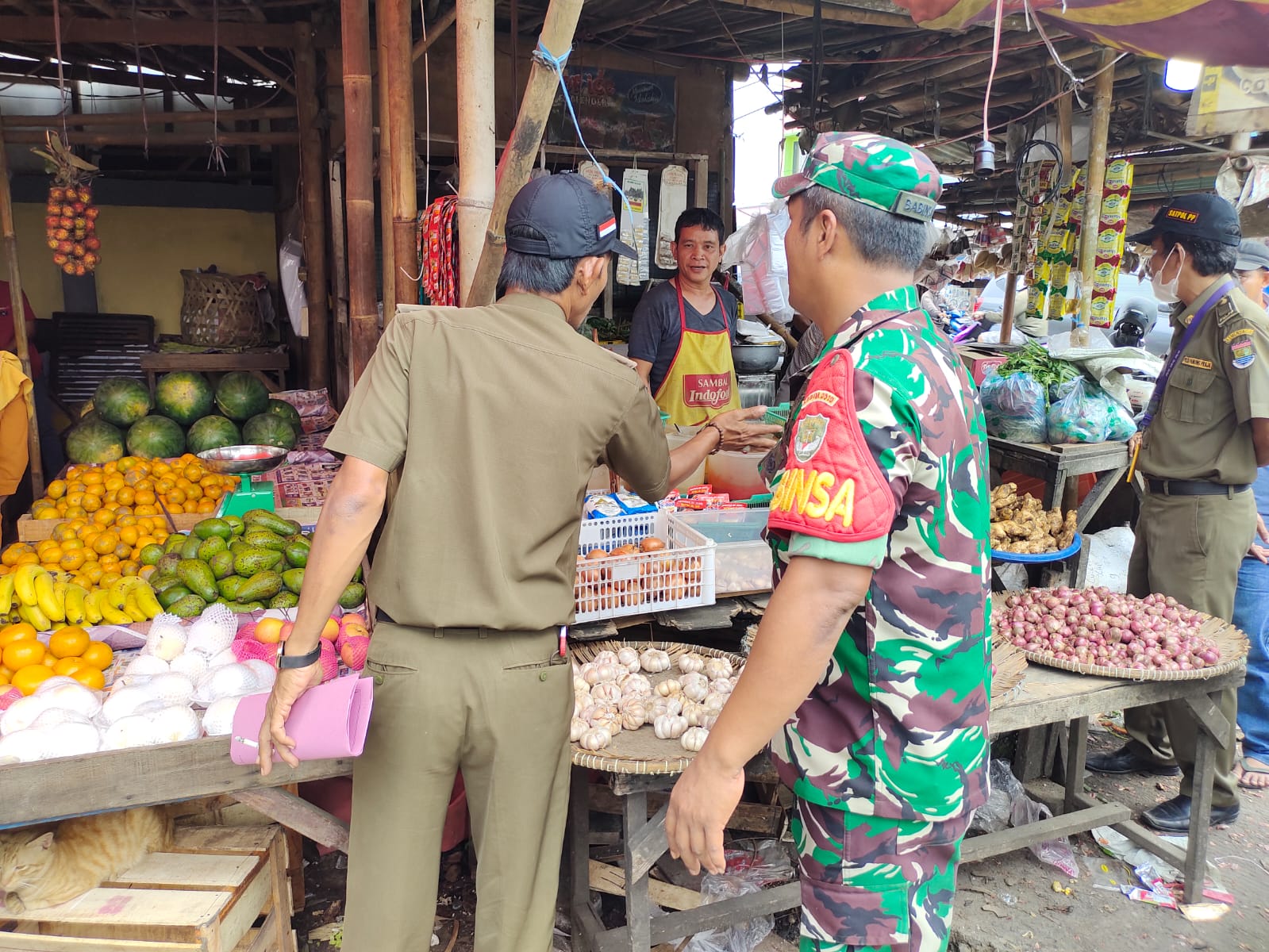 Keterangan Gambar : Babinsa Pondok Jaya, Koramil 10/Sepatan, Kodim 0510/Tigaraksa Sertu Enjon melaksanakan pengecekan ketersediaan harga kebutuhan pokok sembako
