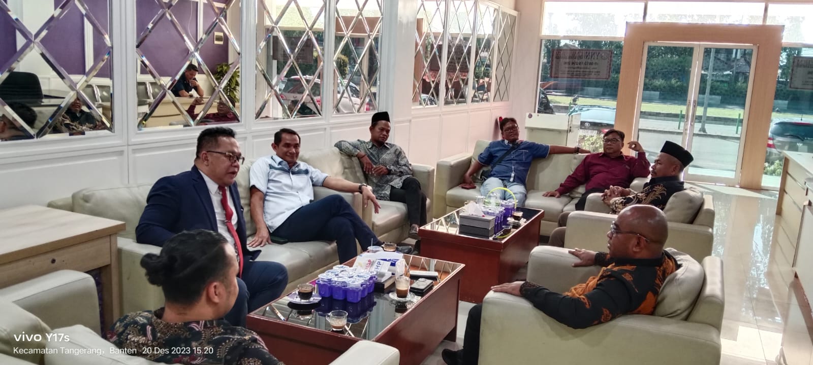 Eno Syafrudien disambut oleh Nelson dan Jefry serta anggota Tim dari kantor YNN Law Firm, saat kedatangannya ke kantor yang beralamat di Ruko Ayodhya Kelurahan Kelapa Indah Kota Tangerang, Kamis (20/12/23).