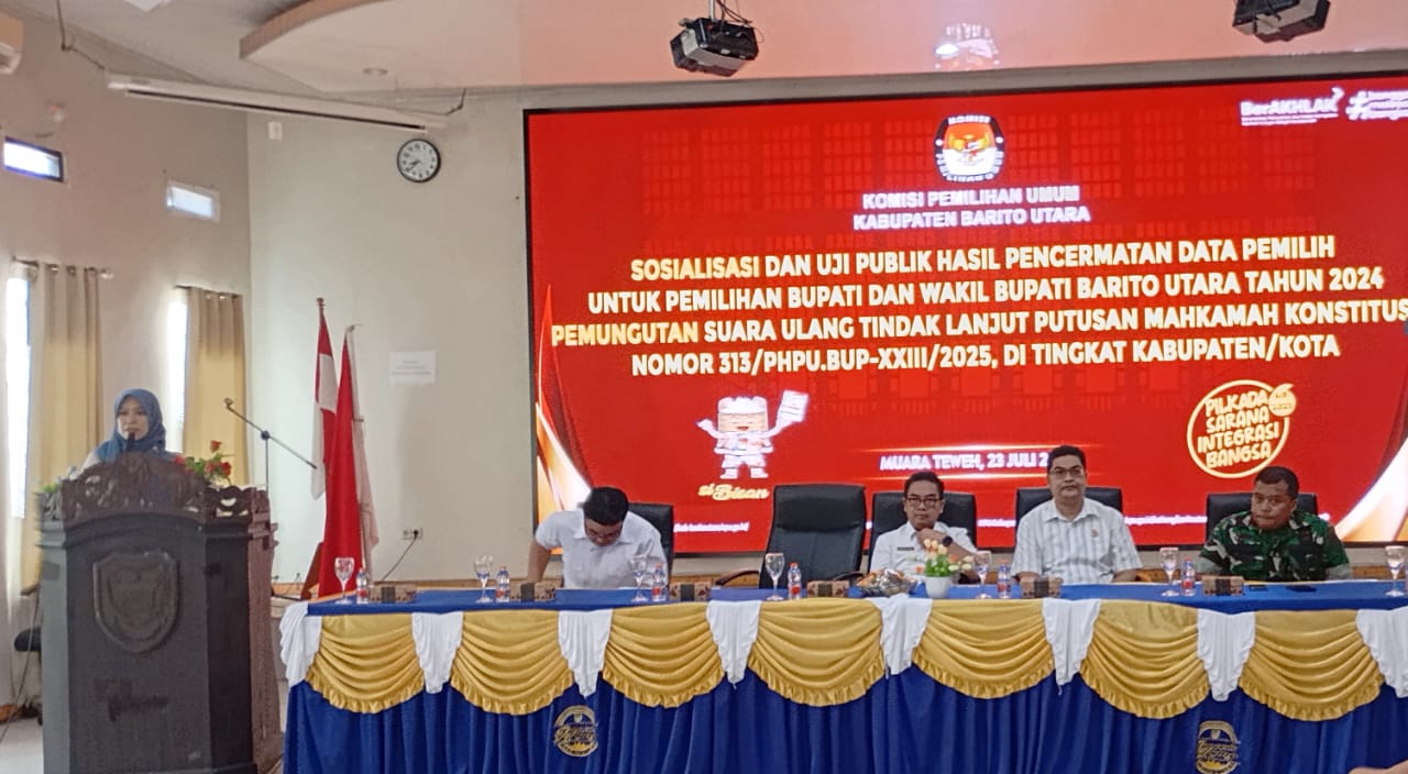 MEGAPOLITANPOS.COM - Muara Teweh- Sosialisasi dan uji Publik Hasil pencermatan data Pemilih untuk pemilihan Suara Ulang Kepala Daerah tahun 2024, Pemungutan Suara Ulang Kabupaten Barito Utara, Rabu (23/07/2025) di