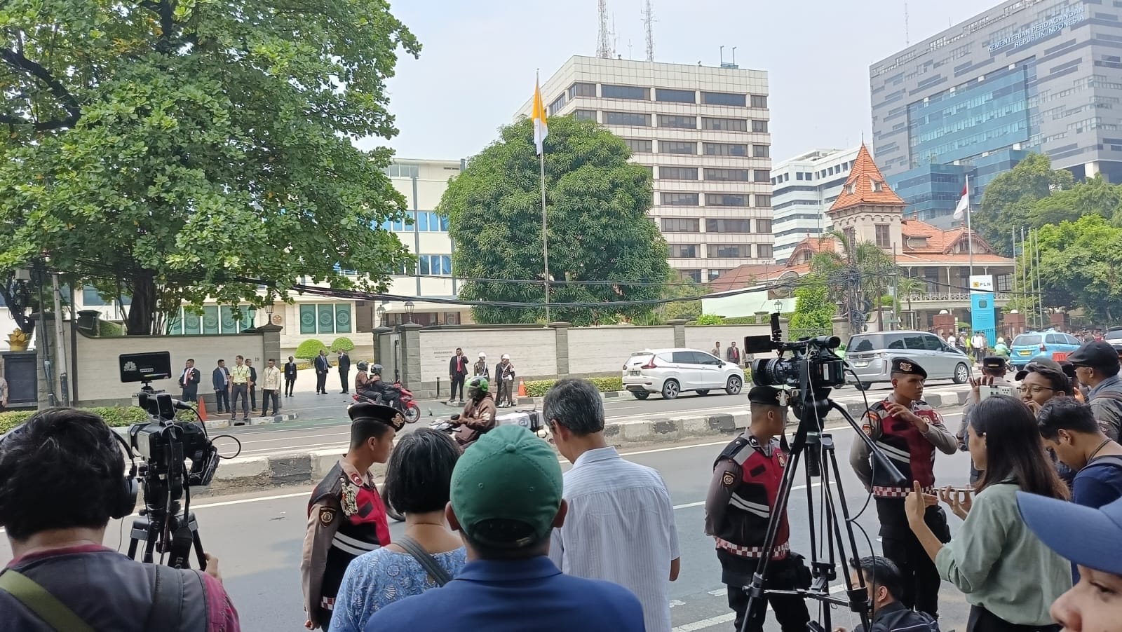Sementara itu, ratusan wartawan dan umat Katolik memadati jalan di seberang Kedutaan Besar Vatikan di Jalan Merdeka Timur, Selasa (3/9/2024). Mereka menunggu kehadiran pemimpin umat Katolik sedunia yang dijadwalkan tiba di Kedubes Vatikan sekitar pukul 12.30 WIB.