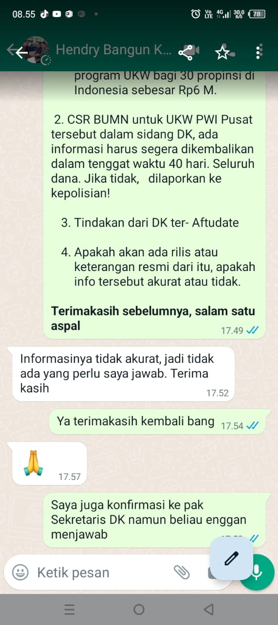 Terakhir media ini kembali melakukan upaya konfirmasi kepada Ketua Umum PWI Pusat Henry Ch Bangun untuk mencari jawaban terkait permasalahan tersebut dan dijawab dengan tegas Bahwa itu tidak akurat.