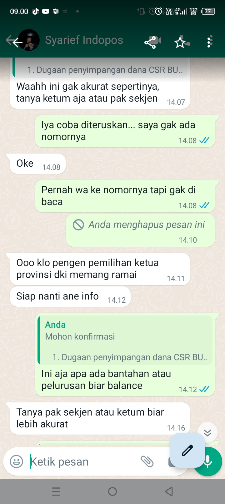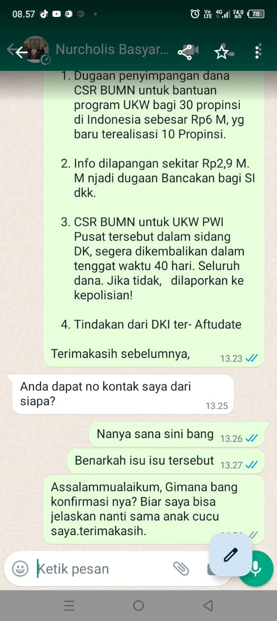 Dari total dana CSR BUMN Rp6 Miliar untuk UKW PWI Pusat itu yang sudah diambil Rp 4,6 miliar dalam beberapa termin. Rinciannya, Rp1,8 miliar, Rp1,8 miliar, dan Rp1 miliar. Jadi sisa belum.diberikan oleh BUMN Rp1,4 M.