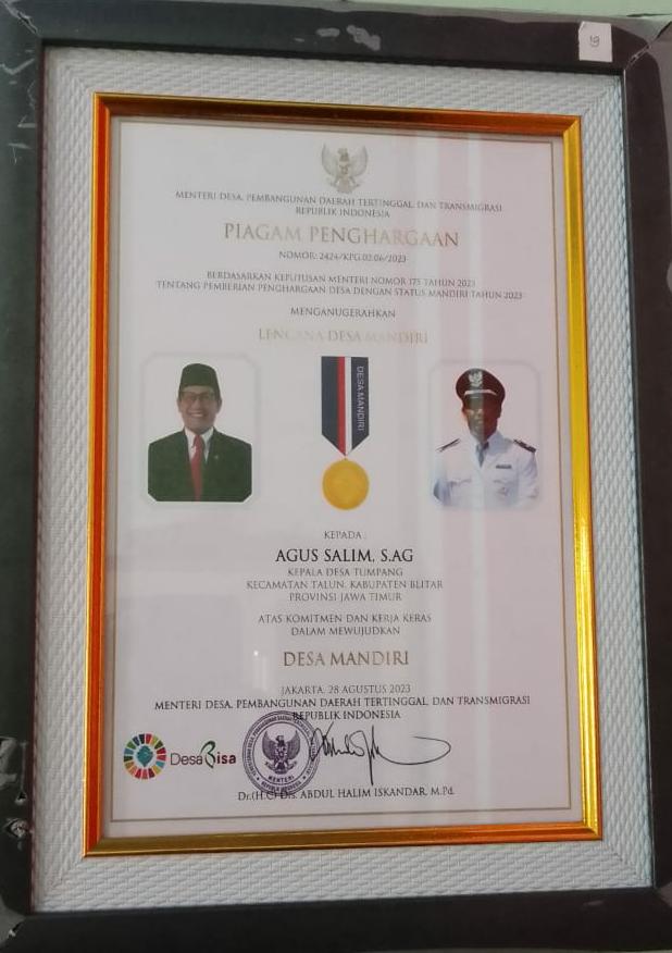 MEGAPOLITANPOS.COM, Blitar - Pemerintah Desa Tumpang Kecamatan Talun atas kerja kerasnya selama ini dalam mewujudkan desa mandiri mendapat anugerah penghargaan dari Kementerian Desa, Pembangunan Daerah Tertinggal, dan Transmigrasi (Kemendesa PDTT) kepada desa atas komitmen dan kerja keras dalam mewujudkan Desa Mandiri tahun 2023.