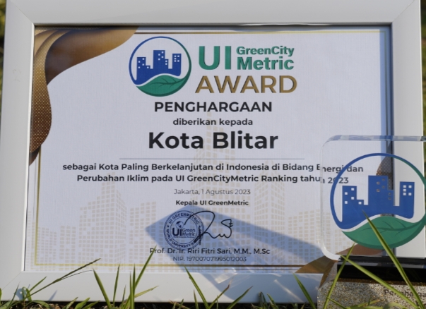 Penyerahan penghargaan diterimakan pada Selasa, (01/08/2023) dari Universitas Indonesia (UI) Green City Metric saat itu diterima langsung oleh Wali Kota Blitar, Drs. H. Santoso, M.Pd. dari Kepala Sekretariat Nasional SDGs Kementerian PPN/Bappenas Dr. Vivi Yulaswati,M.Sc dan Kepala UI Green Metric Prof. Dr. Ir. Riri Fitri Sari, MM, M.Sc di Balai Sidang Universitas Indonesia.