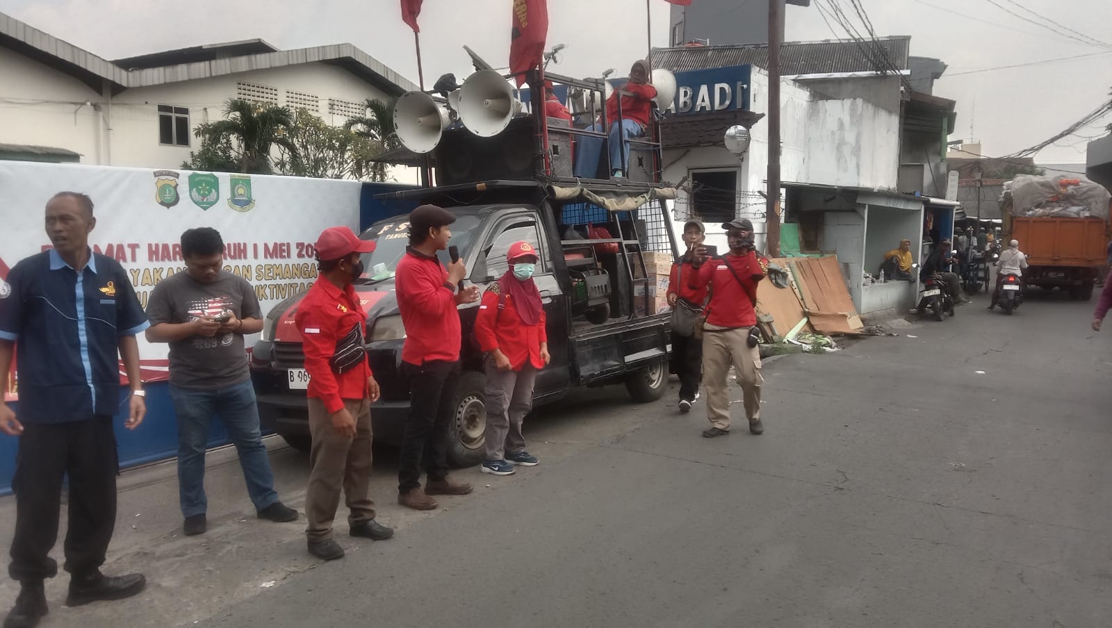 MEGAPOLITANPOS.COM Kota Tangerang - Menjaga Kamtibmas di wilayah binaan Personil Koramil 02/Btc, Kodim 0506/Tgr memonitoring langsung kegiatan aksi Unjuk Rasa (Unras) lanjutan karyawan PT. Naha Sakti Abadi Jalan Yos Sudarso Kelurahan Jurumudi Baru Kecamatan Benda Kota Tangerang, Jum'at (16/05/2025).