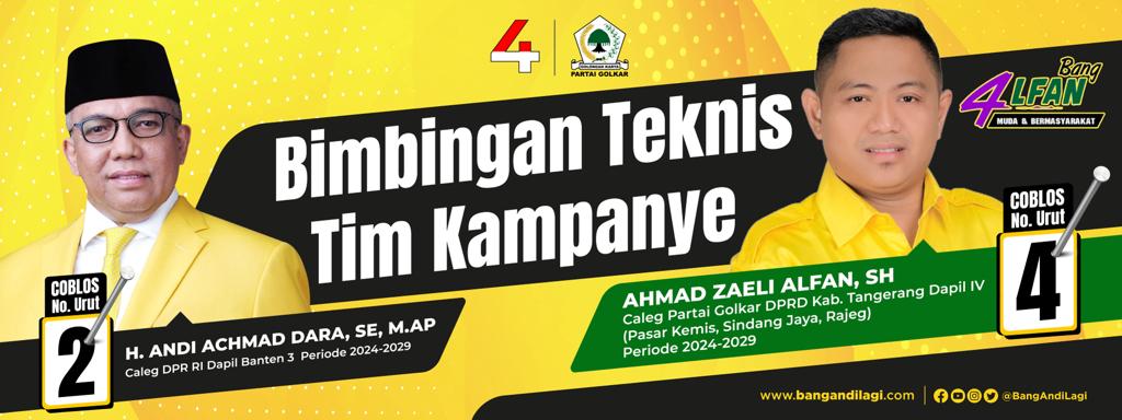 Bimtek tim Pemenangan dan Jaringan Relawan yang dihadiri 700 Kordinator TPS Pemenang dan Relawan Bang Alfan Calon Anggota DPRD Kabupaten Tangerang Nomor urut 4, dan H.Andi Achmad Dara S.E., M.AP, Calon Anggota DPR RI, dari Dapil Banten 3 Periode 2024-2029. Dan juga dihadiri oleh Bapak H.Madromli S.H., M.M., Ketua DPD Golkar Kabupaten Tangerang, yang berlangsung di Perumahan Talaga Bestari, Desa Wanakerta Kecamatan Sindang Jaya, Kabupaten Tangerang.
