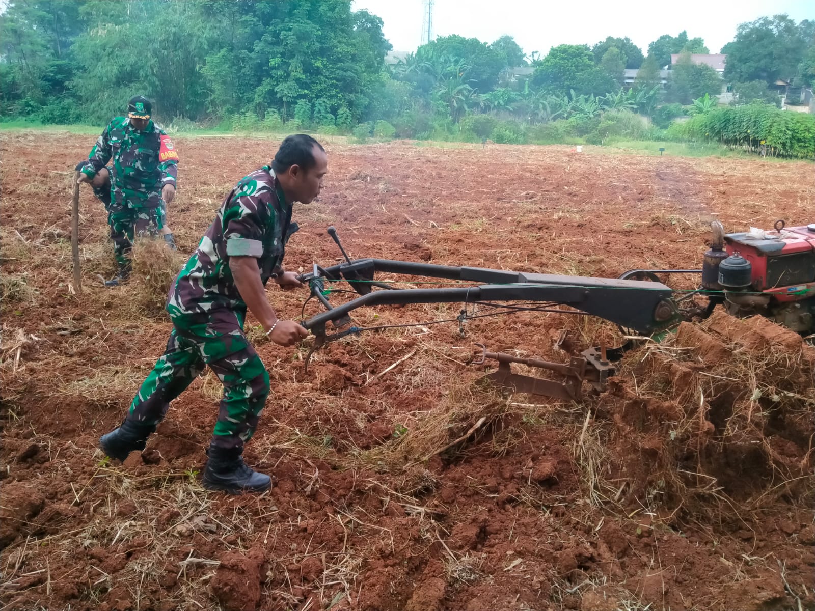 “Saat ini Anggota Koramil 01/Tgr yang di pimpin Sertu Rudiyanto sedang melakukan persiapan lahan dengan melakukan pembajakan lahan membersihkan rumput dan ilalang.