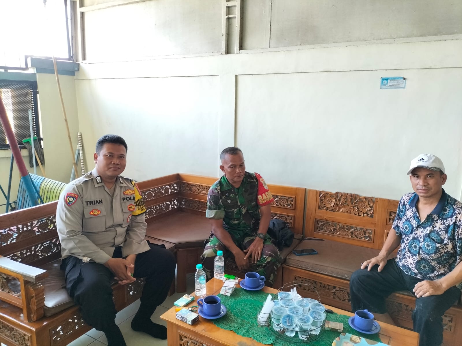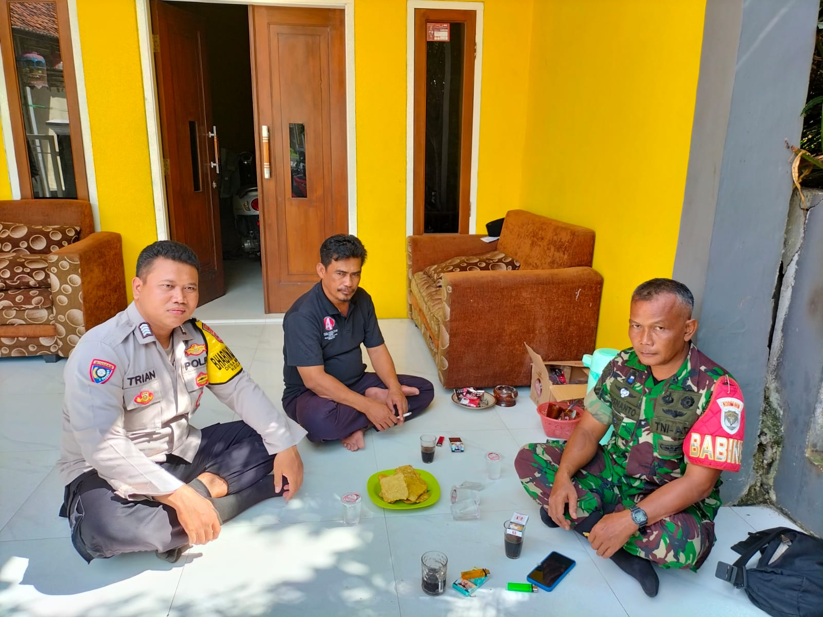 MEGAPOLITANPOS.COM Tigaraksa - Babinsa Sertu Kusnanto dari Koramil 12/Rajeg, bersama dengan Lurah Bapak Fadlah, Kader Posyandu, RW Engkun, dan Pak RT Madin, melakukan silaturahmi ke kediaman tokoh masyarakat Pak H Hasan di Kp Priuk, Kabupaten Tangerang, Sabtu (06/07/2024).. Kehadiran mereka bertujuan untuk memperkuat keamanan dan ketertiban (trantib) di lingkungan sekaligus mengantisipasi dampak cuaca buruk yang sedang melanda, terutama dalam kondisi hujan.