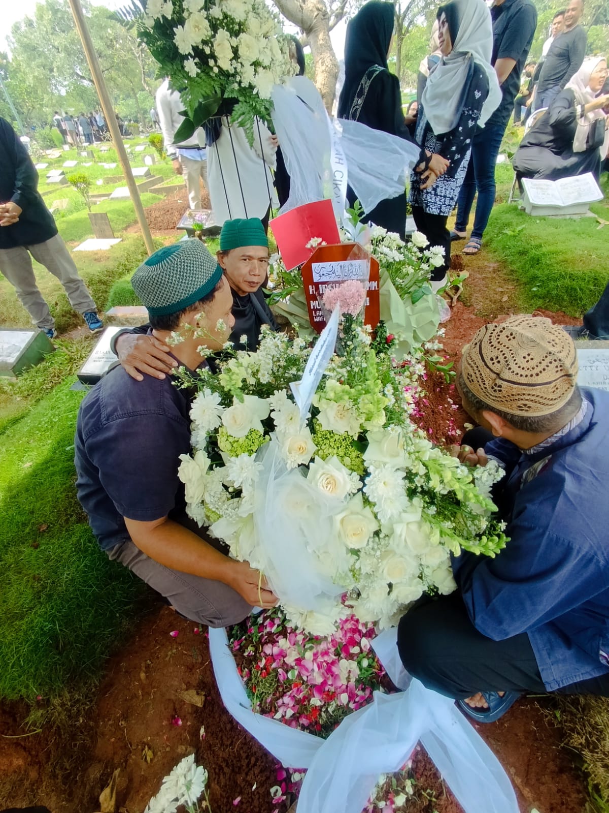 Karangan bunga ucapan belasungkawa memenuhi area rumah duka, menandakan luasnya jejaring dan persahabatan yang dibangun almarhum semasa hidup.
