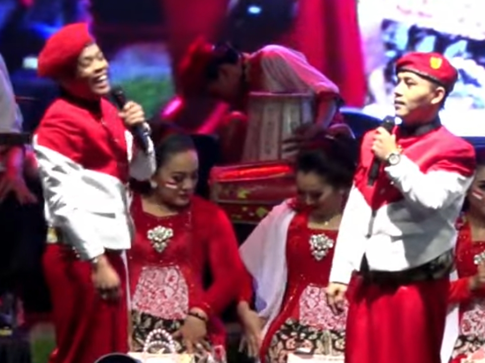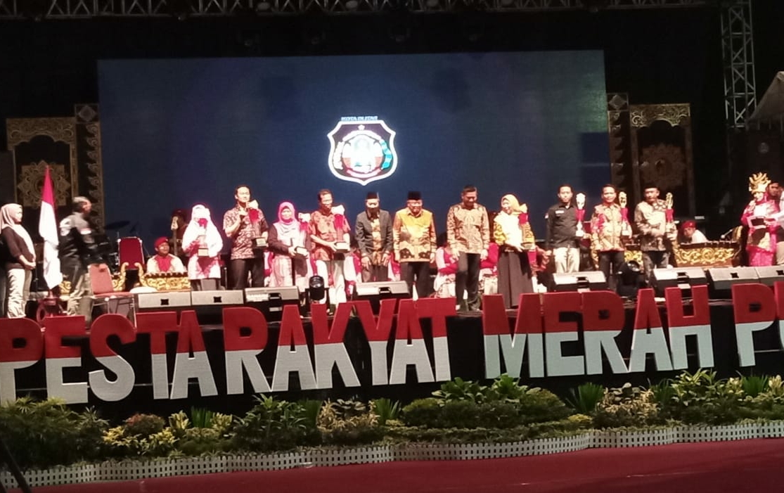 Pesta rakyat merah putih malam tasakuran resepsi HUT RI ke 78, Pemkot Blitar sengaja menampilkan seniman lokal, dengan penampilan seniman lokal akan mampu mengangkat potensi budaya di kota Blitar, seperti penyajian hiburan guyon maton bersama cak percil cs. ( adv/za/mp )