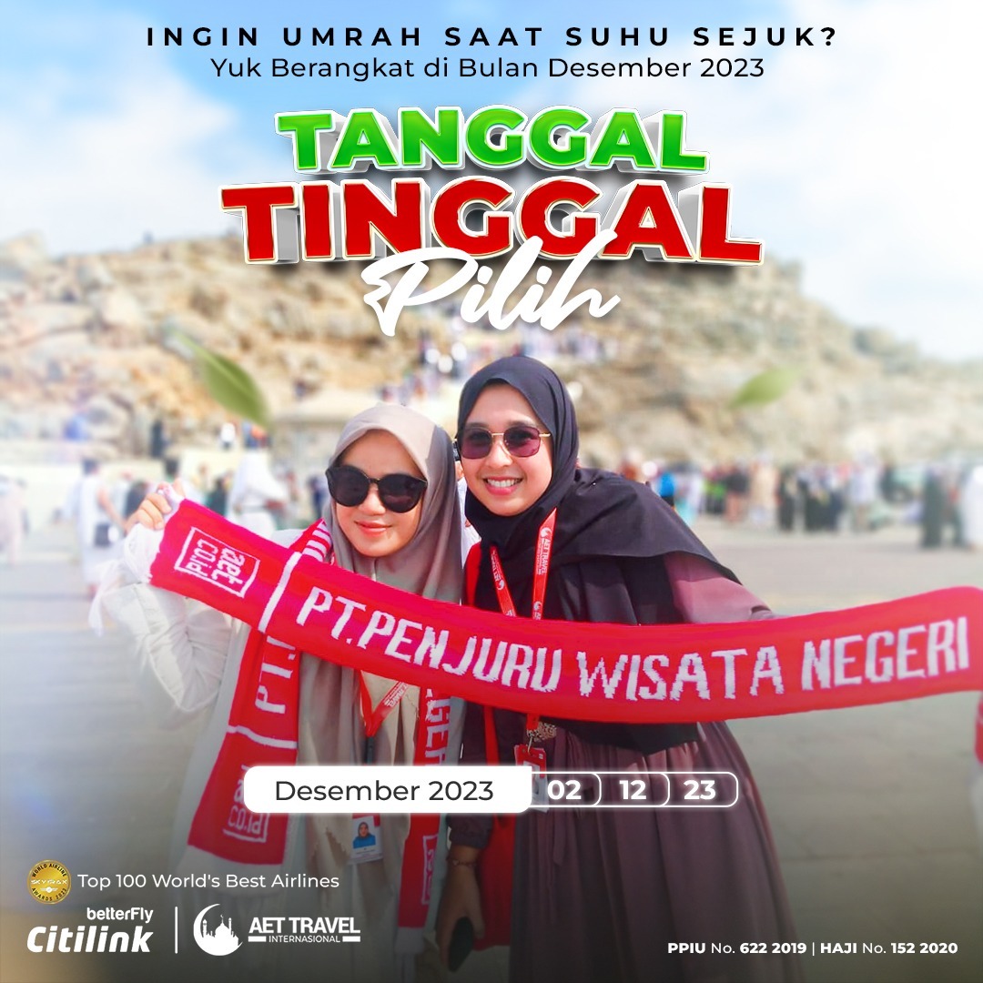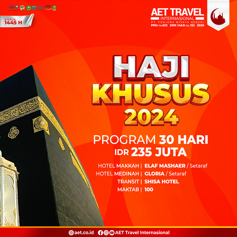 Untuk diketahui AET Travel Internasional adalah Perusahaan Penyelenggara Ibadah Umrah (PPIU) berizin resmi berdasarkan keputusan Kementrian Agama RI dengan nomor 622 tahun 2019 (Sebelumnya dengan izin resmi Kementrian Agama RI dengan nomor 382 tahun 2016). Dan juga Penyelenggara Ibadah Haji Khusus berizin resmi Kementrian Agama RI nomor 152 tahun 2020. (Adv/Doni)