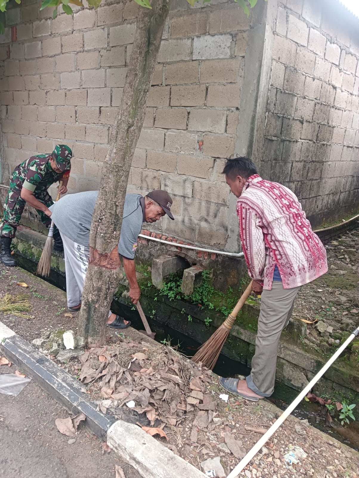 Keterangan Gambar : Babinsa Kelurahan Sumur Pacing, Koramil 01/Tgr, Kodim 0506/Tgr Serda Laksana bersama warga karya bakti pembersihan saluran air
