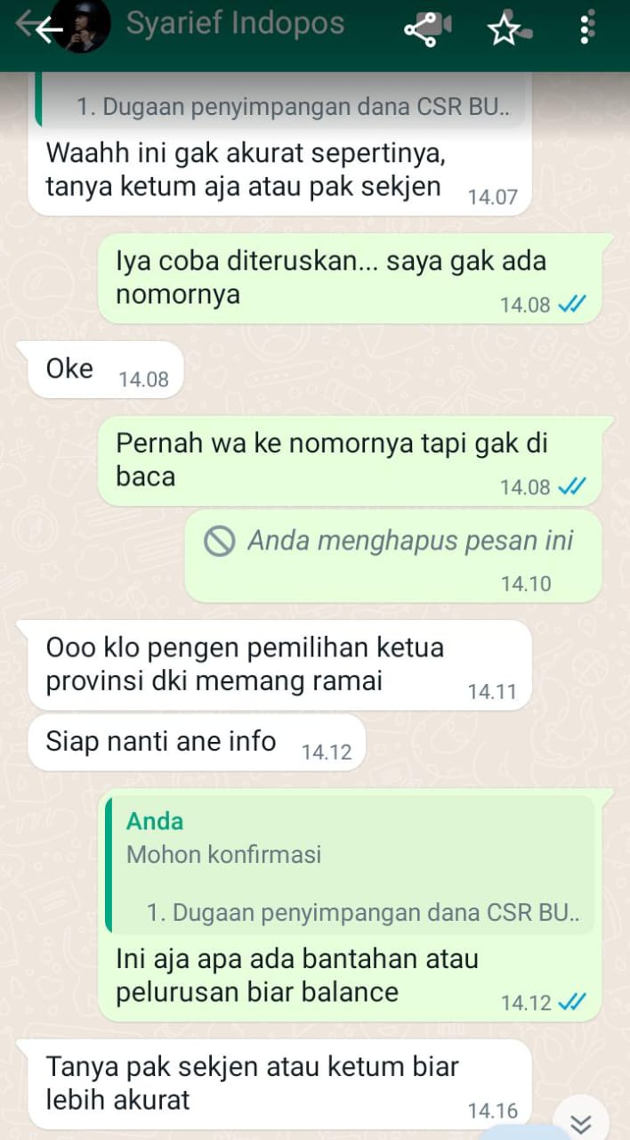 Kemudian di utarakan dalam surat Nomor: 20/IV/DK/PWI-P/SK-SR/2024 tertanggal 16 April 2024 yang ditanda tangani Ketua DK Sasongko Tedjo dan Sekretaris DK Nurcholish MA Basyari telah terjadi pelanggaran pengelolaan dana bantuan CSR Kementerian BUMN untuk penyelenggaraan Uji Kompetensi Wartawan (UKW) PWI 2023/2024 di 10 provinsi.