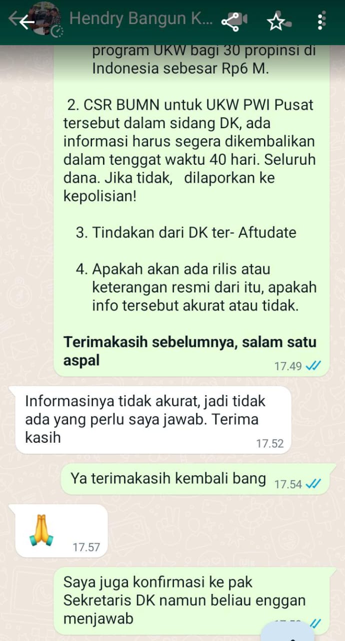 Sekretaris DK Nurcholish MA Basyari saat dikonfirmasi belum lama ini melalui seluler mengatakan, bahwa Surat Keputusan DK PWI Pusat memang telah disampaikan kepada ketua umum Hendry Ch Bangun, namun apa tanggapannya silahkan menghubungi ketu.