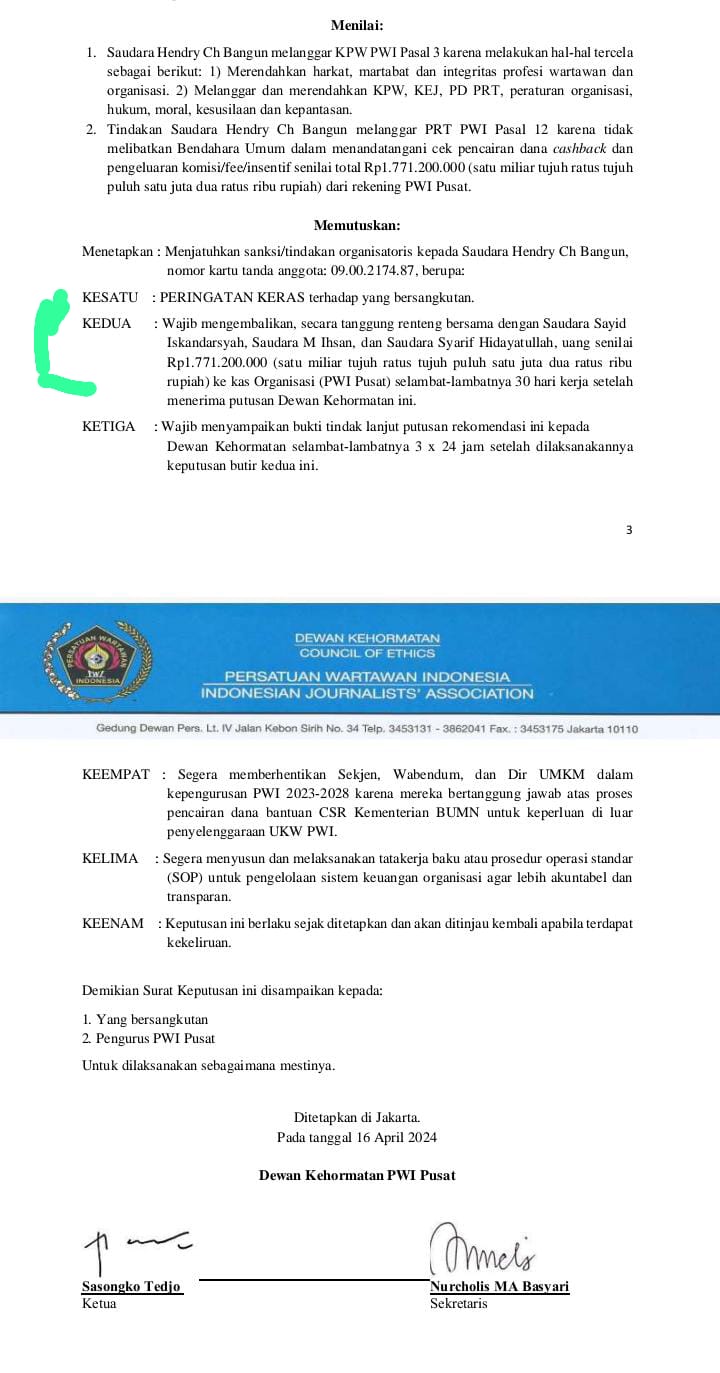 Dalam surat tersebut berbunyi demi tegaknya ketaatan terhadap PD, PRT, KEJ, dan KPW guna tetap terjaganya wibawa dan marwah organisasi PWI, Dewan Kehormatan perlu mengambil tindakan/menjatuhkan sanksi organisatoris terhadap yang bersangkutan.