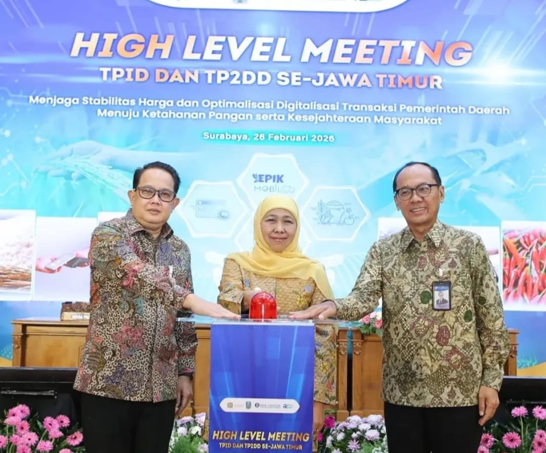 dalam acara bertajuk High Level Meeting Tim Pengendalian Inflasi Daerah (TPID) Jawa Timur dan Tim Percepatan dan Perluasan Digitalisasi Daerah (TP2DD), Kamis (26/02/26), di Gedung Grahadi, Surabaya.