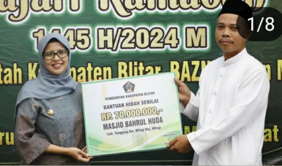 Selain itu orang nomor satu di Pemerintah Kabupaten Blitar juga berkenan menyerahkan bantuan hibah kepada masing - masing untuk takmir masjid Bahrul Huda sebesar 70 juta dan kepada takmir masjid Baitun Najah Kelurahan Wlingi sebesar 62,5 juta rupiah untuk pembelian bedug.