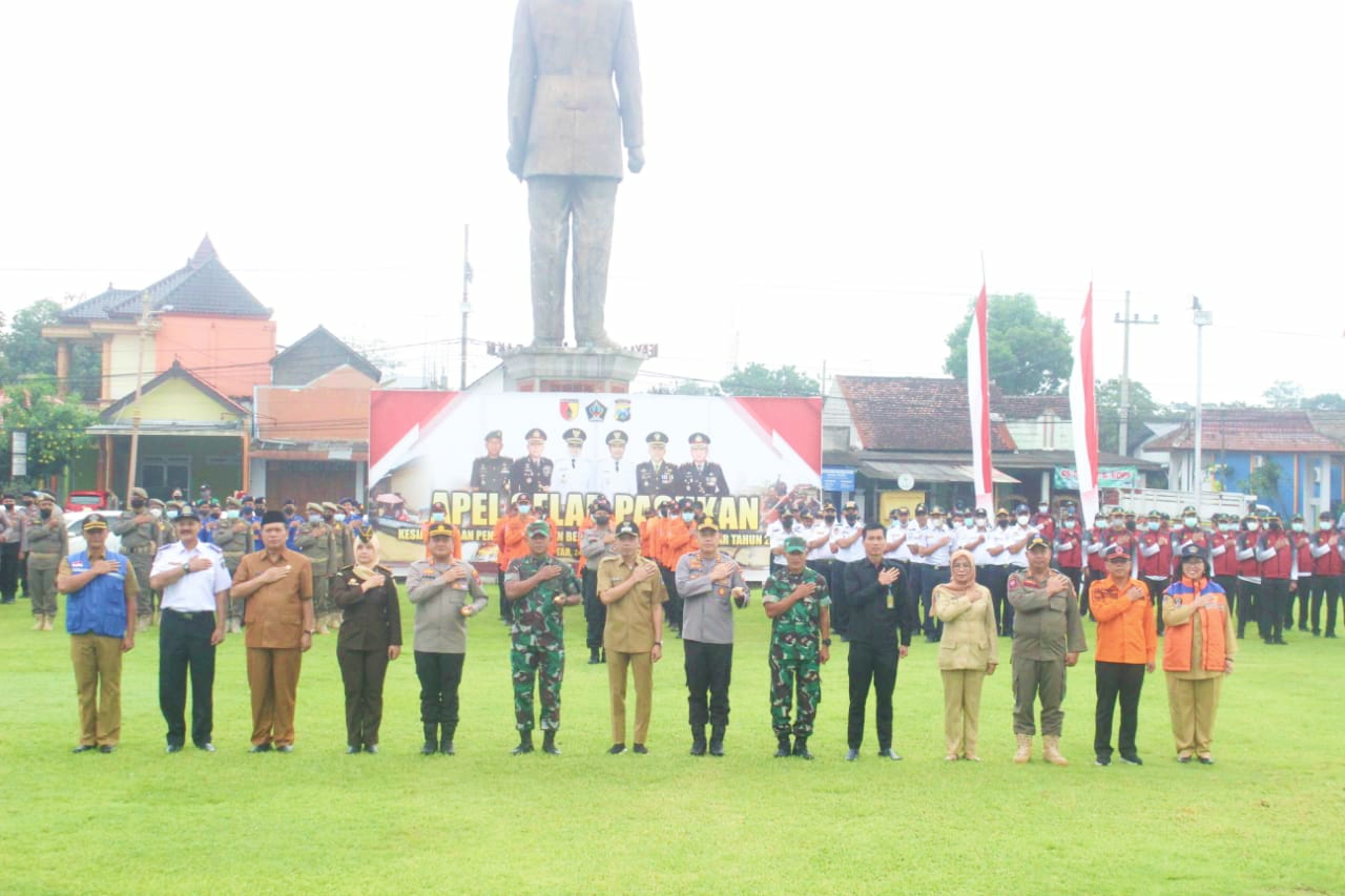 Keterangan Gambar : Wabup Blitar Rahmat Santoso pimpin apel kesiap siagaan bencana didampingi kapolres, Dandim 0808 di aloon - aloon kankab kanigoro