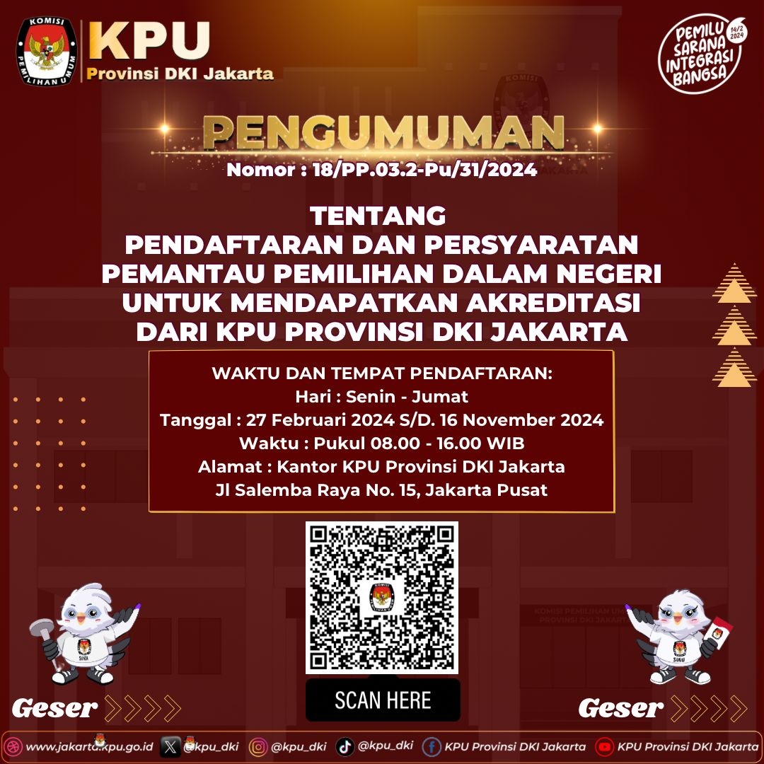 MEGAPOLITANPOS.COM, Jakarta- Komisi Pemilihan Umum (KPU) Provinsi DKI Jakarta resmi membuka pendaftaran pemantau pemilihan Gubernur dan Wakil Gubernur Provinsi DKI Jakarta Tahun 2024 pada 27 Februari 2024. Hal tersebut berdasarkan Peraturan Komisi Pemilihan Umum Nomor 2 Tahun 2024 tentang Tahapan dan Jadwal Pemilihan Gubernur dan Wakil Gubernur, Bupati dan Wakil Bupati, serta Walikota dan Wakil Walikota Tahun 2024.