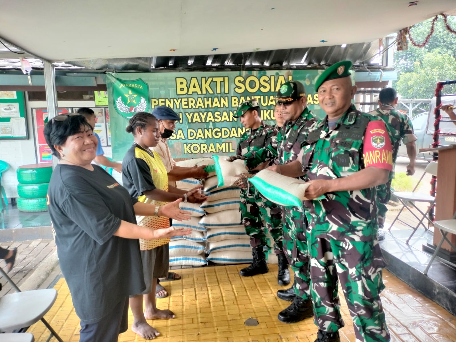 Keterangan Gambar : Kodim 0510/Trs yang di wakili Danramil 03/Legok Kapten Arh P. Sihitang menyerahkan Bantuan Beras dari Pangdam Jaya kepada Yayasan Beriku Hati di Kampung Baru RT 05/02 Desa Dangdang Kecamatan Cisauk