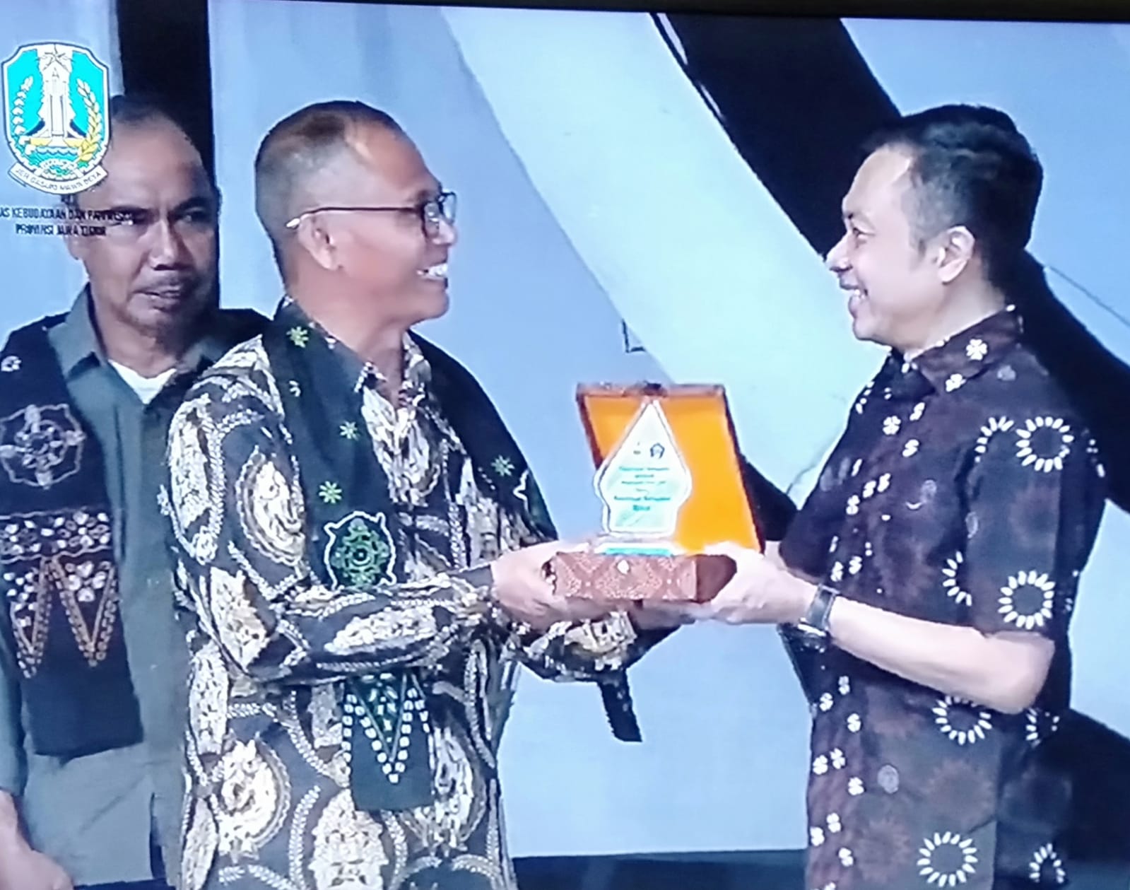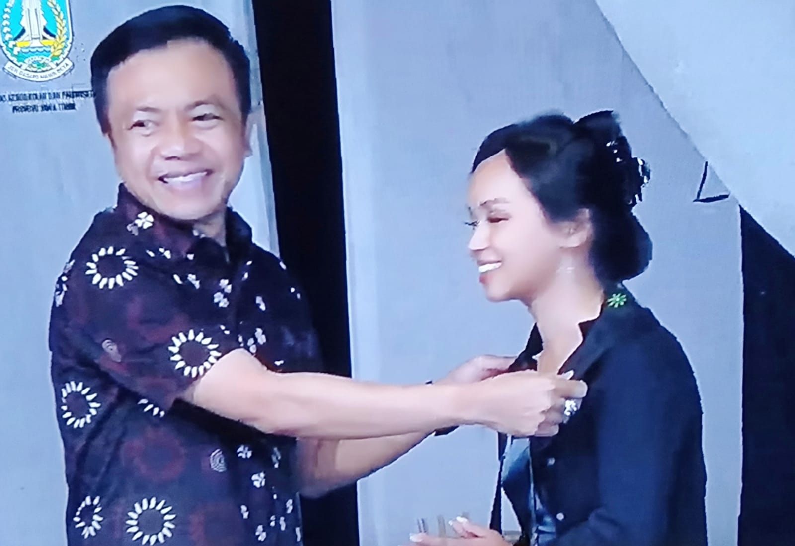 Keterangan Gambar : Wakil Bupati Blitar Rahmat Santoso serahkan pusaka cakra manggilingan kepada tokoh pemeran Sri Kresna di amphiteater penataran