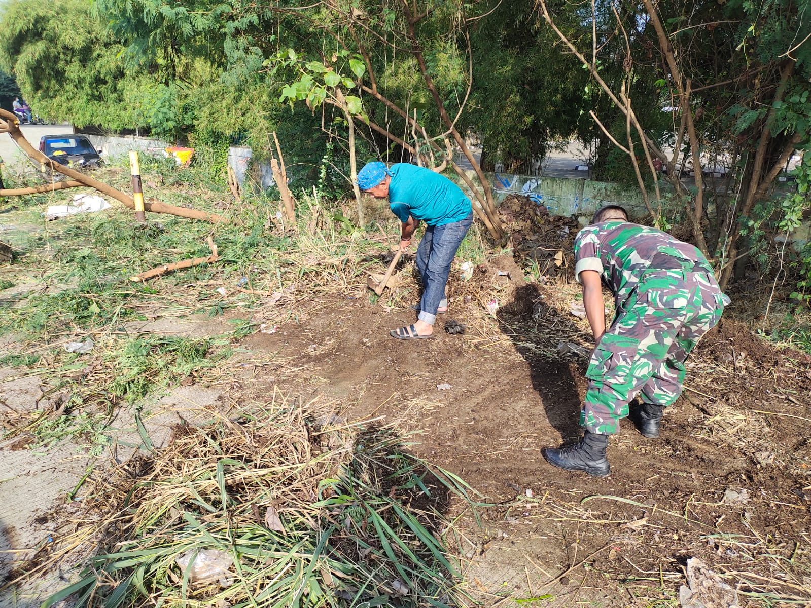 Keterangan Gambar : Babinsa Kelurahan Karawaci, Koramil 01/Tgr, Kodim 0506/Tgr Peltu Bambang Wahyudi bersama warga lakukan gotong royong