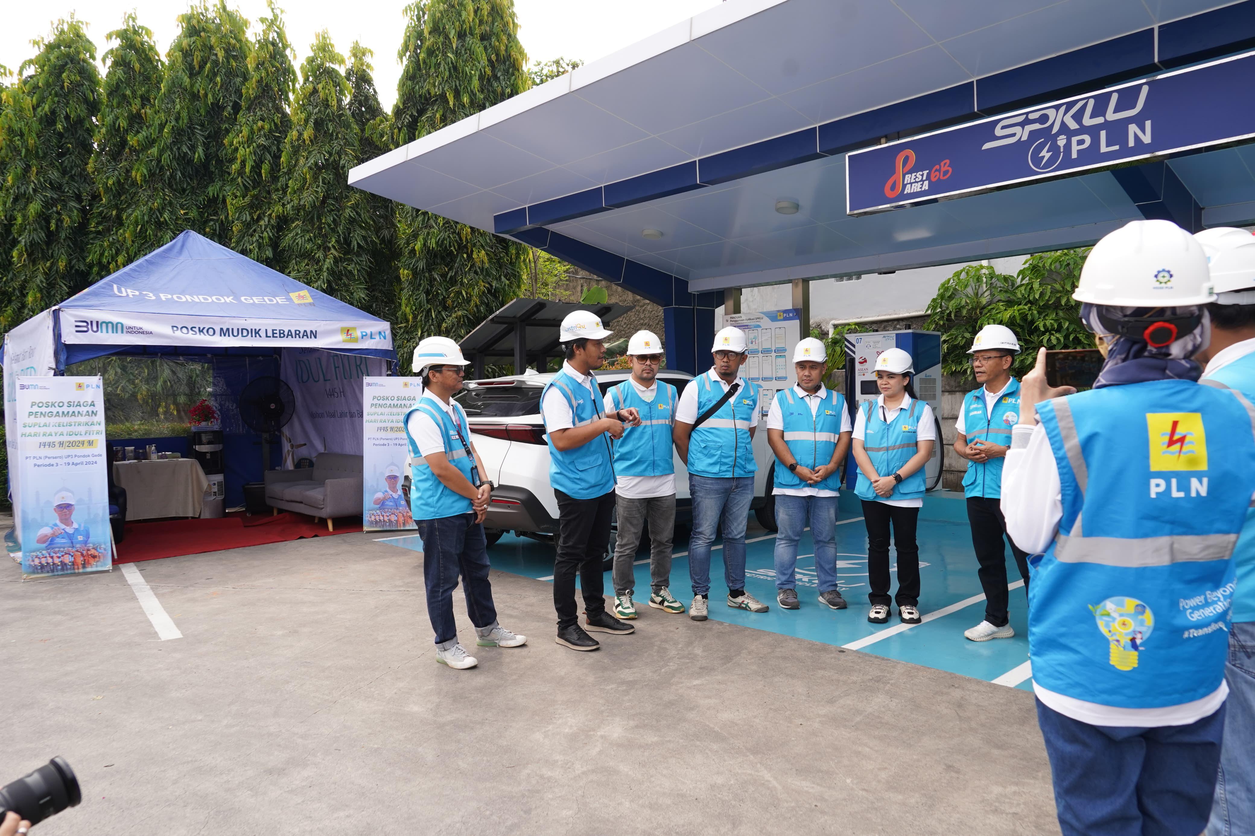 Poto: Koordinasi dengan para petugas PLN yang bersiaga di SPKLU jalur mudik di depan SPKLU Rest Area Tol Jakarta-Cikampek KM 6 dan Posko Siaga Mudik yang berada tepat disamping SPKLU