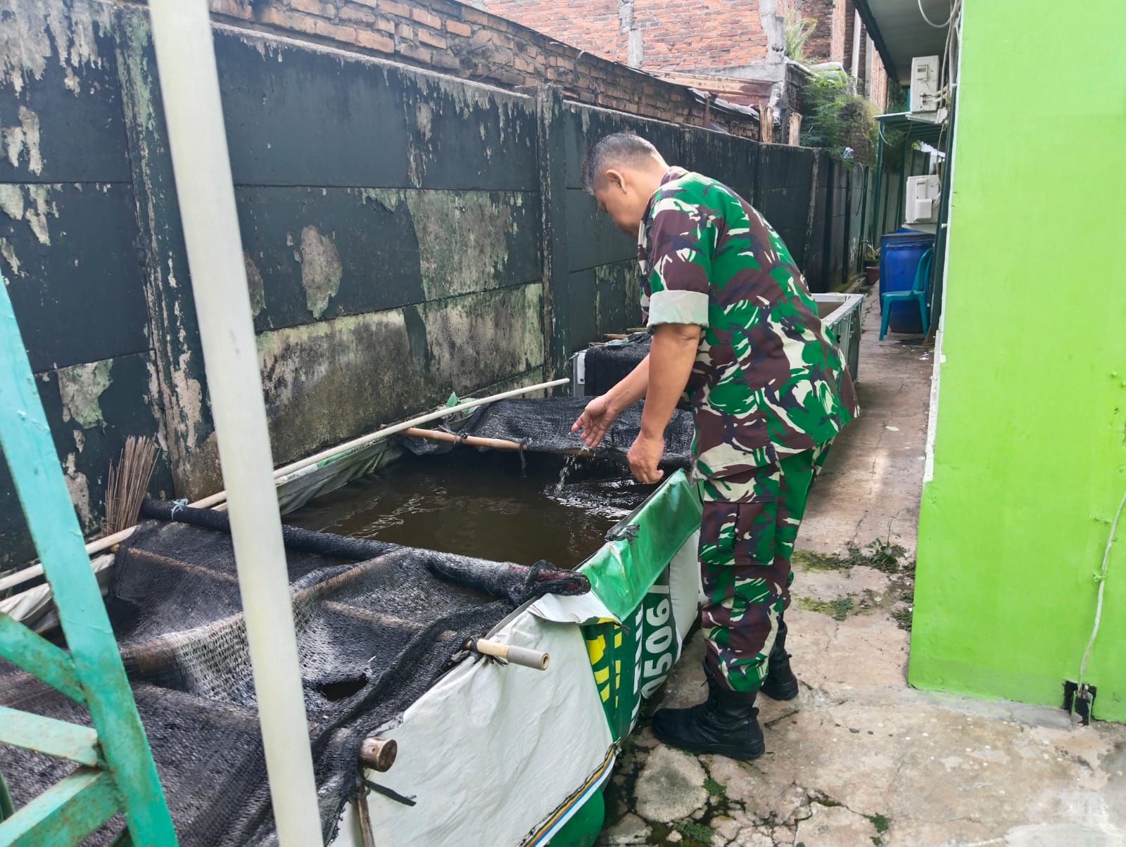 MEGAPOLITANPOS.COM Kota Tangerang - Dalam mempertahankan program dan mewujudkan ketahanan pangan Babinsa Kelurahan Sudimara Timur Koramil 04/Ciledug Kodim 0506/Tgr Serda Eko S melakukan perawatan tanaman terong, Cabai dan memberi makan ikan lele di MaKoramil 04/Ciledug, Minggu (26/02/2023).