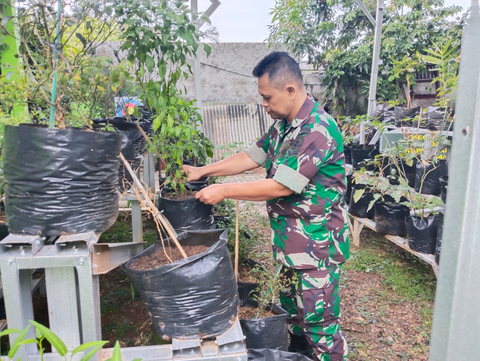 Keterangan Gambar : Babinsa Kelurahan Sudimara Timur Koramil 04/Ciledug Kodim 0506/Tgr Serda Eko S melakukan perawatan tanaman terong