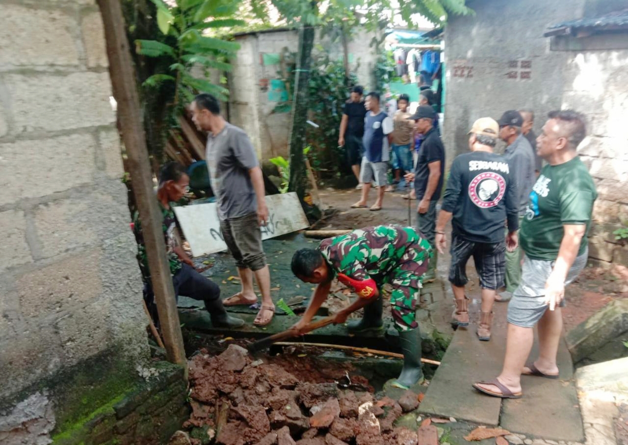 Keterangan Gambar : Babinsa Cilenggang, Koramil 03/Serpong, Kodim 0506/Tangerang bersama warga, melaksanakan Karya Bakti (Karbak) membersihkan lingkungan di wilayah Kelurahan Cilenggang, Kecamatan Serpong Kota Tangsel, Rabu (21/12/2022).