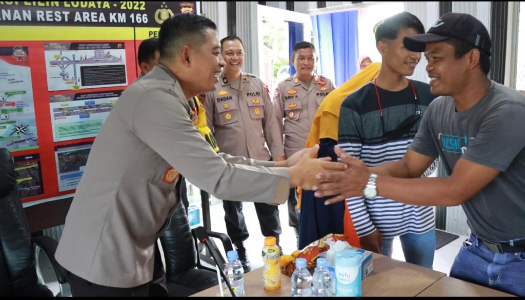 Keterangan Gambar : Kapolres Majalengka AKBP Edwin Affandi bersama anak yang terpisah dengan keluarga saat singgah di Rest Area.