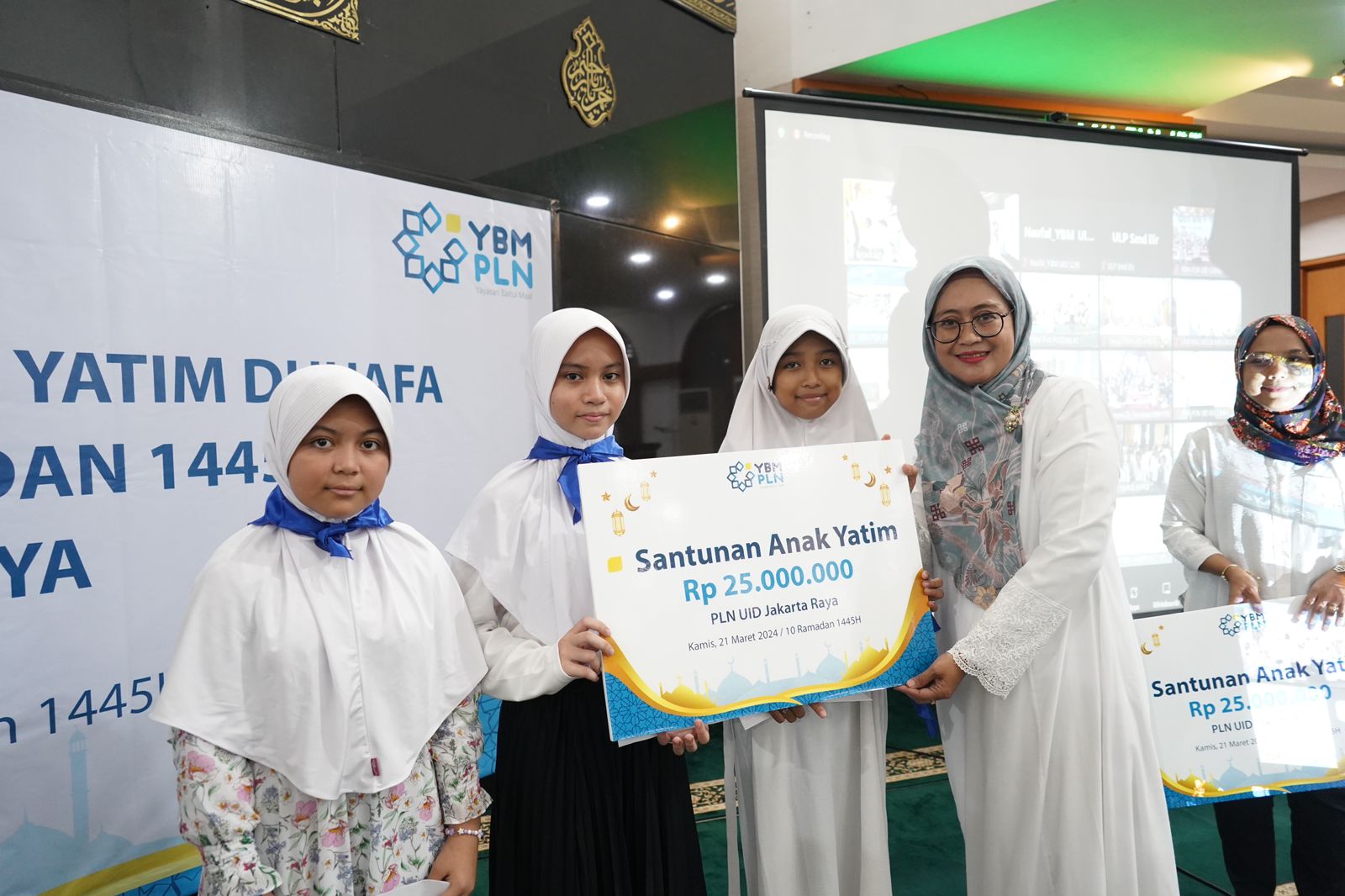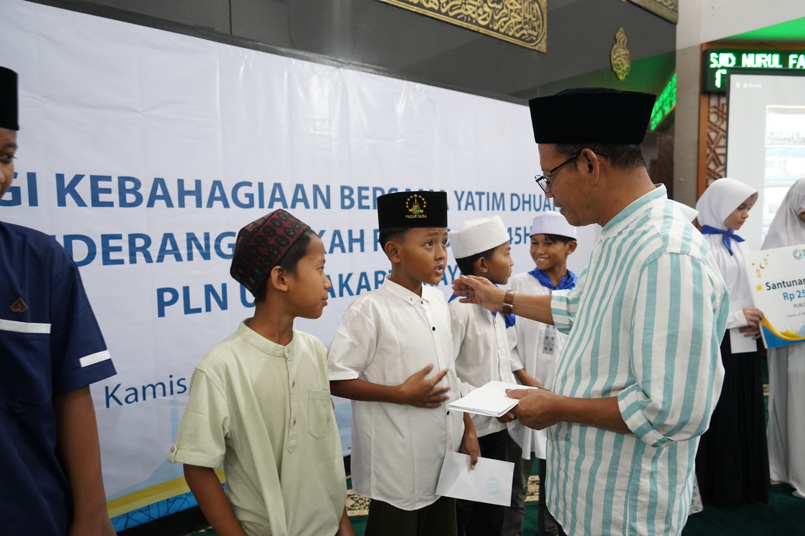 Poto: General Manager PLN UID Jakarta Raya, Lasiran saat menyerahkan santuan kepada adik-adik perwakilan dari Yayasan Masjid Al Firdaus